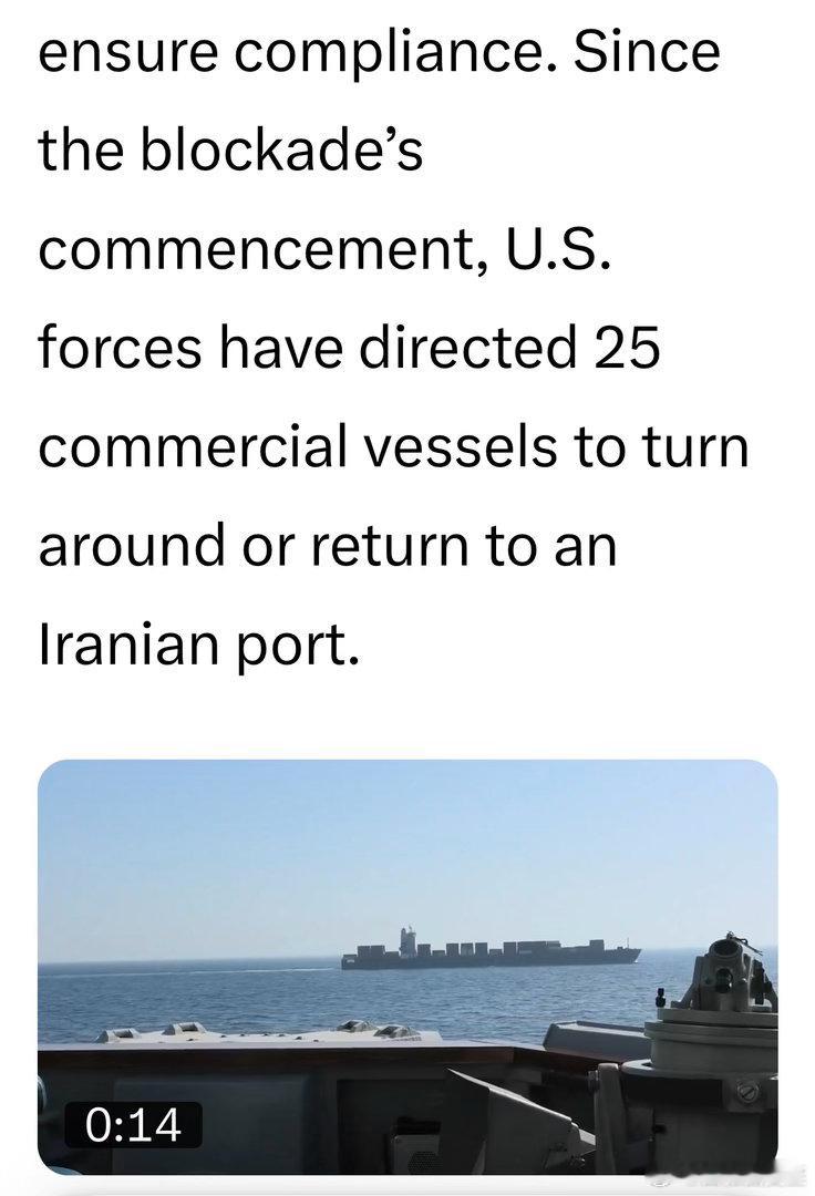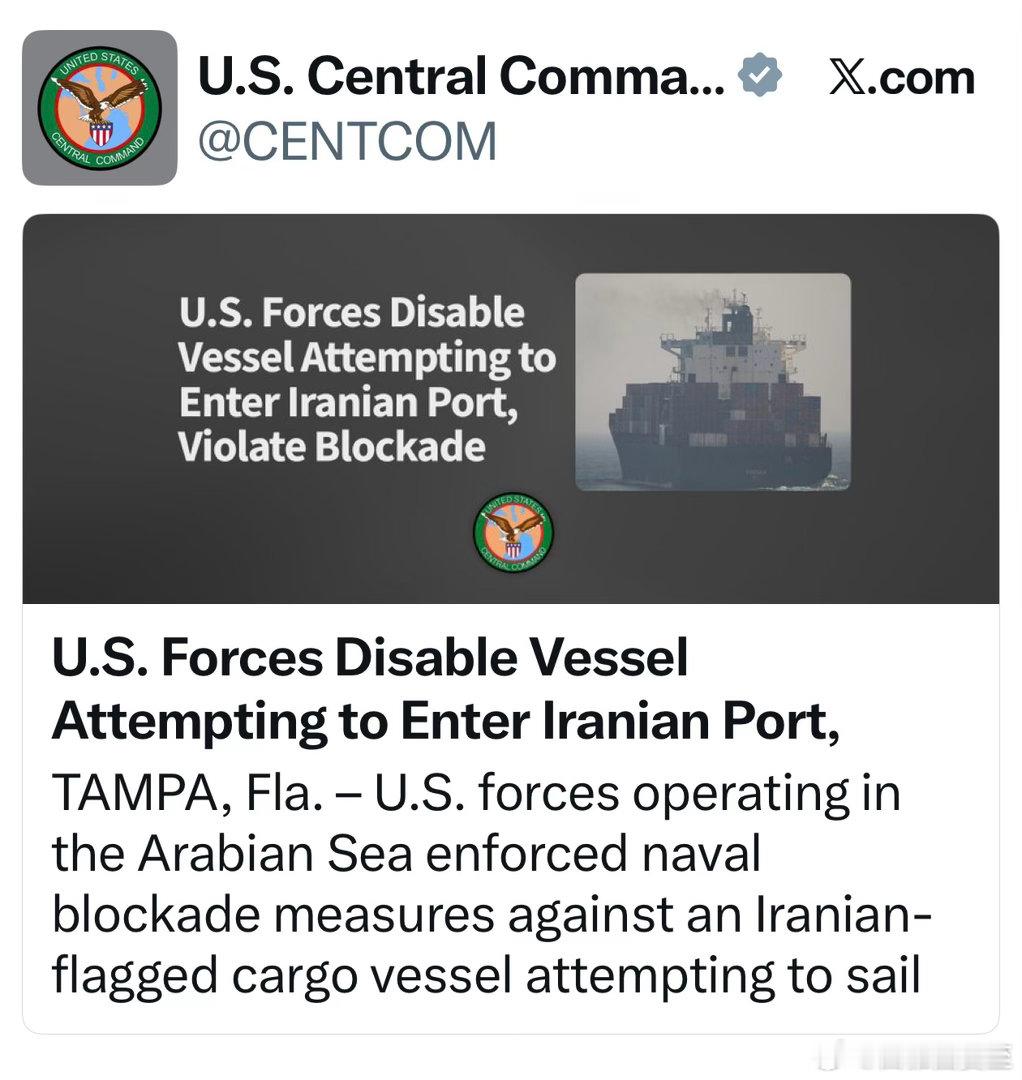 美军官宣:4月19,阿拉伯海,一艘挂伊朗旗的货船,驶向伊朗港口…美军喊话“正实施封锁”、要求“返航”,货船继续行驶…多次沟通无果,美军驱逐舰通知船员撤离机房、随后炮击机房,货船失去动力、海军陆战队登船