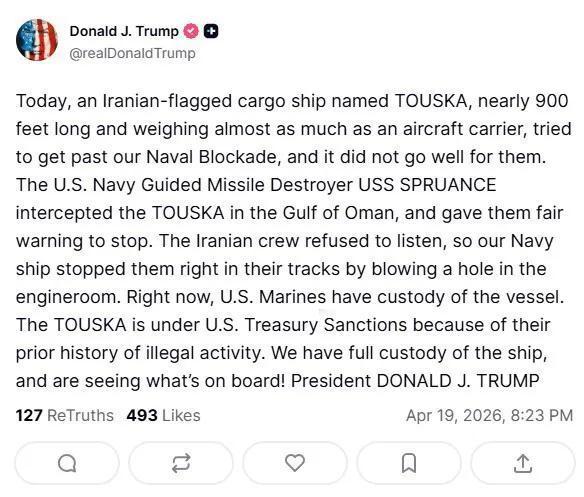 特朗普在Truth Social上发帖称,美军今天早些时候在该船试图突破美国封锁后扣押了该船——目前封锁伊朗港口周围已实施。
