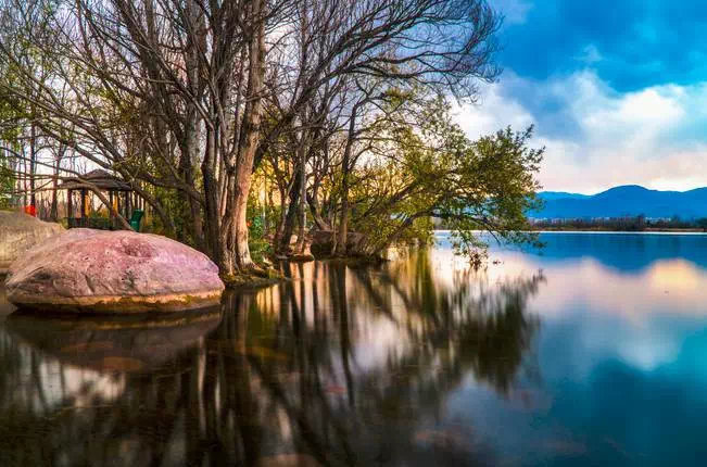 晒图笔记大赛园内湖水澄澈如镜,碧波轻漾,岸边绿柳垂丝,与湖上小桥相映成趣。自然风