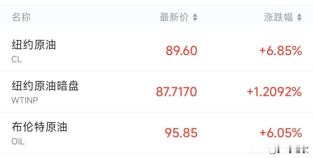 现在就是双方未达成一致,霍尔木兹海峡还在封锁当中,今天开盘资本市场没有骗人,开盘原油市场就出现暴涨,原油价格现在上涨6%以上,布伦特原油已经来到95美元以上。