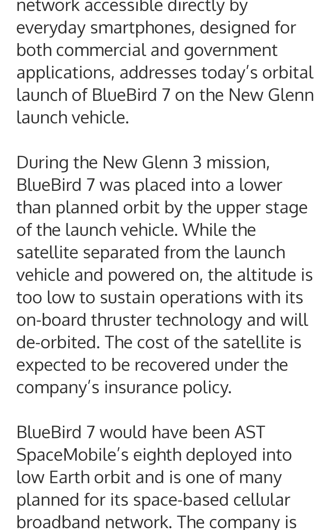 蓝色起源官宣入轨失败,蓝鸟7号卫星被新格伦二级送入了低于预期轨道高度,尽管卫星已