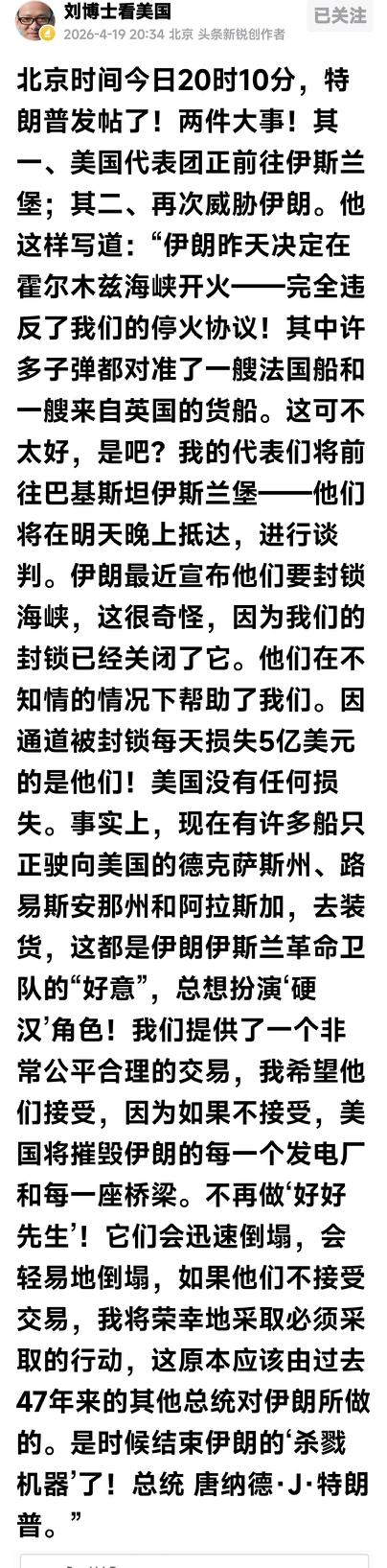 “刘博士”报道,特朗普昨晚发帖讲了两件事:其一、美国代表团正前往伊斯兰堡;其二、再次威胁伊朗。