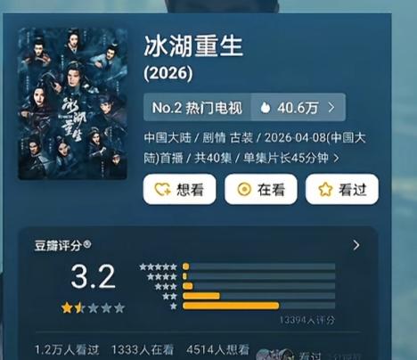 《冰湖重生》扑街了,豆瓣分只有3.2。这个分数说实话,还是打的太高了,是负数才是应该的。看了一下那个女主角的演技,那简直是一塌糊涂,演什么那双眼睛都是一样,空洞无神,根本给不到观众任何的代入感。还有,那就是剧组过度追求组CP,她们还在那里夸剧中有36对CP。这很明显不是为了故事更加精彩,而是为了让人看那个所谓的狗血恋情。她们想打着上一部“楚乔”的名头,继续捧别的演员,没曾想扑街了。并不是观众在挑刺,实在是“冰湖重生”真的没有任何看点,演员演技拉胯,故事情节拼凑,没啥吸引力,低分那也是在所难免。