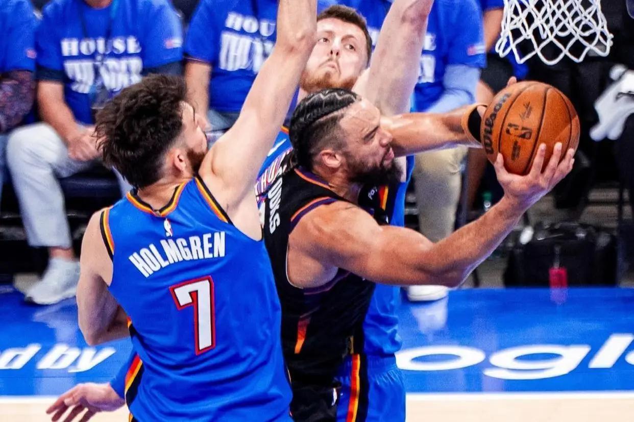 雷霆这边,亚历山大负责造杀伤,杰伦·威廉姆斯22+7+6全能输出,霍姆格伦16分搭起禁飞区。这"三巨头"各司其职,配上多尔特、卡鲁索这些外线铁闸,阵容深度厚得让人绝望。太阳被防成了单打大队,布克被车轮战消耗,内线门户大开。