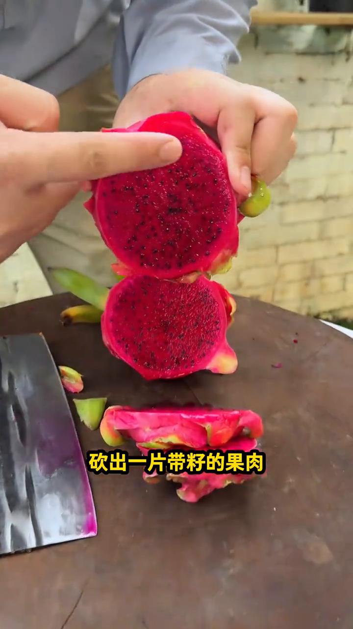 ·吃火龙果别剥皮,砍,砍出一片带籽的果肉。