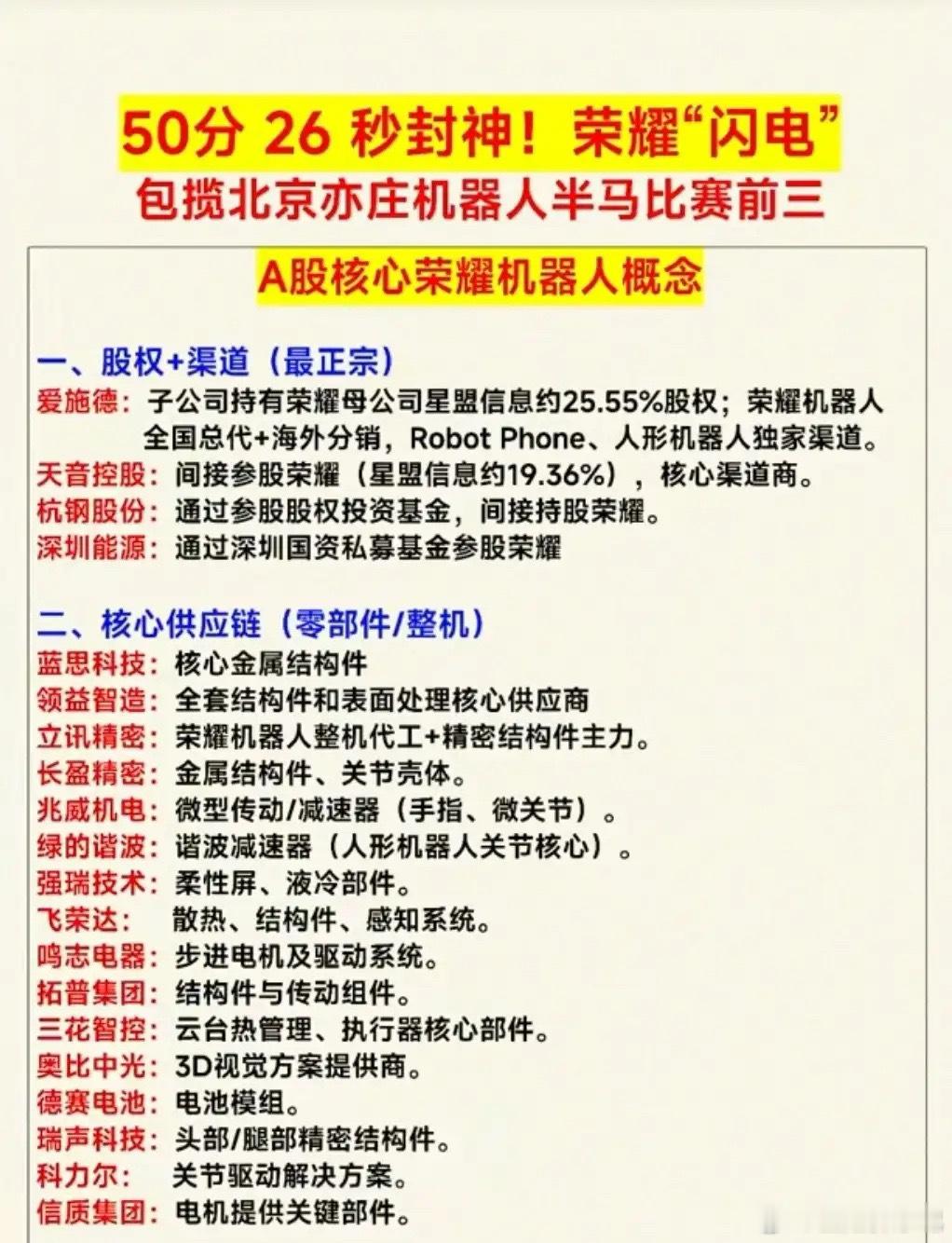 - 机器人半程马拉松引爆市场,荣耀“闪电”机器人包揽前三,带动产业链热度飙升;