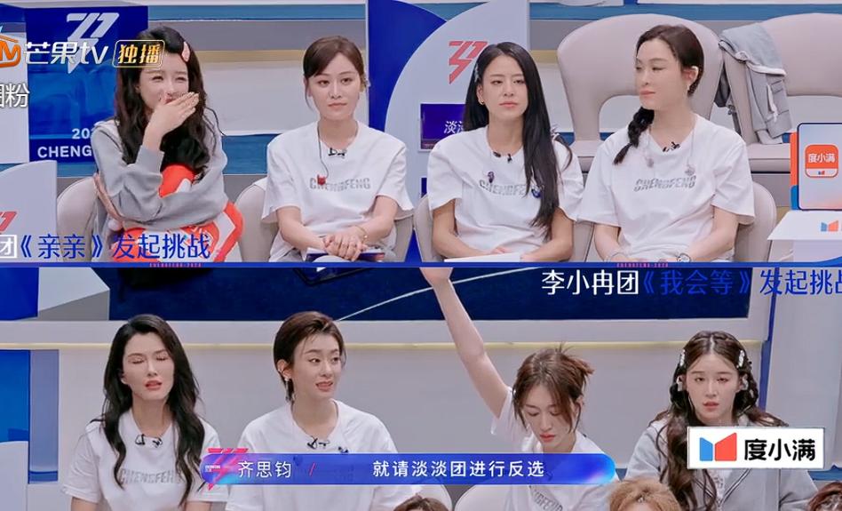 没想到淡淡团只顾练习舞蹈,反倒是歌词都没记住,跑调忘词、唱错词的现象都有,看到这种情况,李小冉团和孙怡团都看到战胜对方的希望,纷纷举手要求挑战。