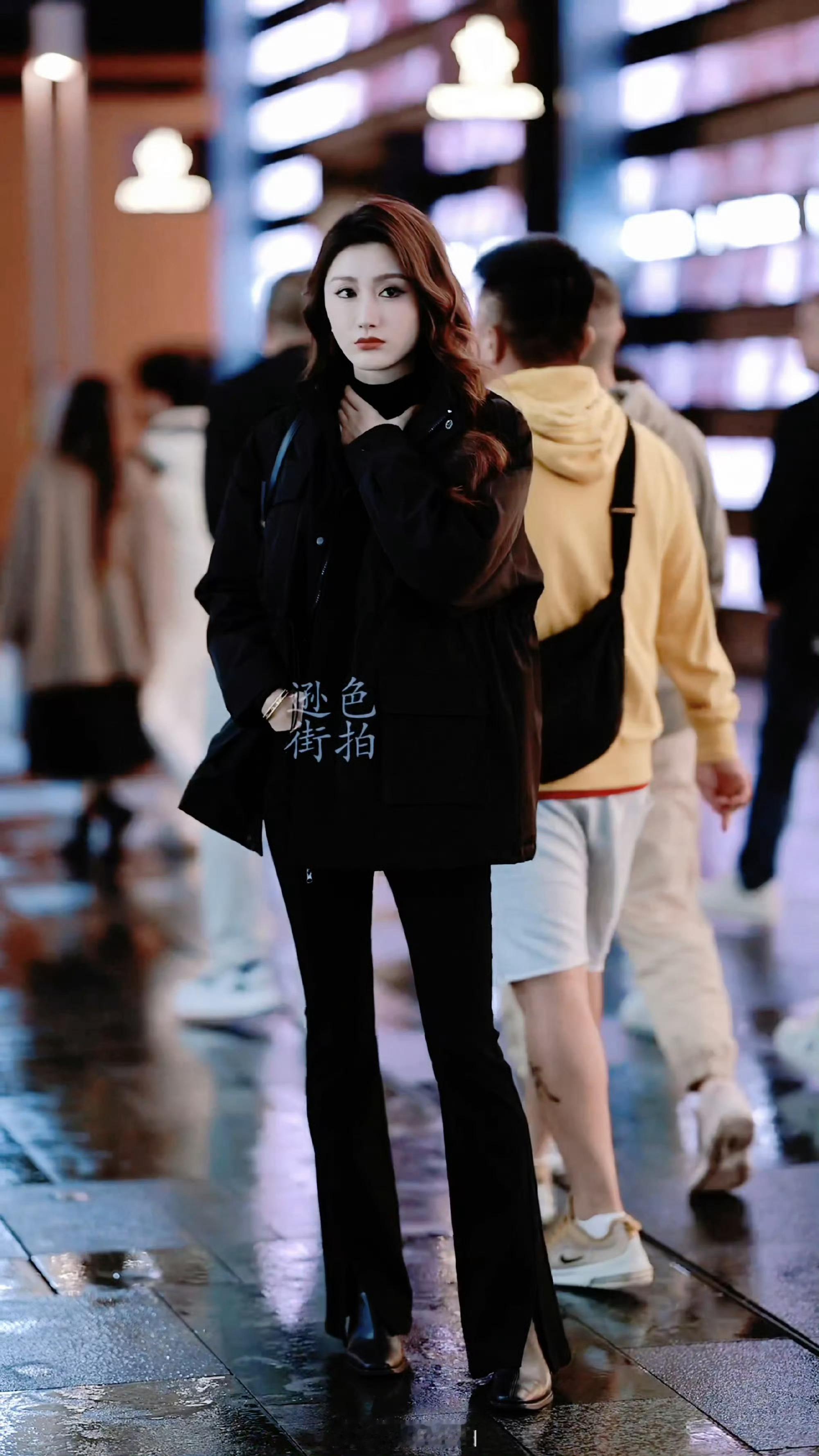 江疏影街拍,一身黑色蛮帅气!她身穿黑色运动套装,廓形外套搭配同系列长裤,利落又