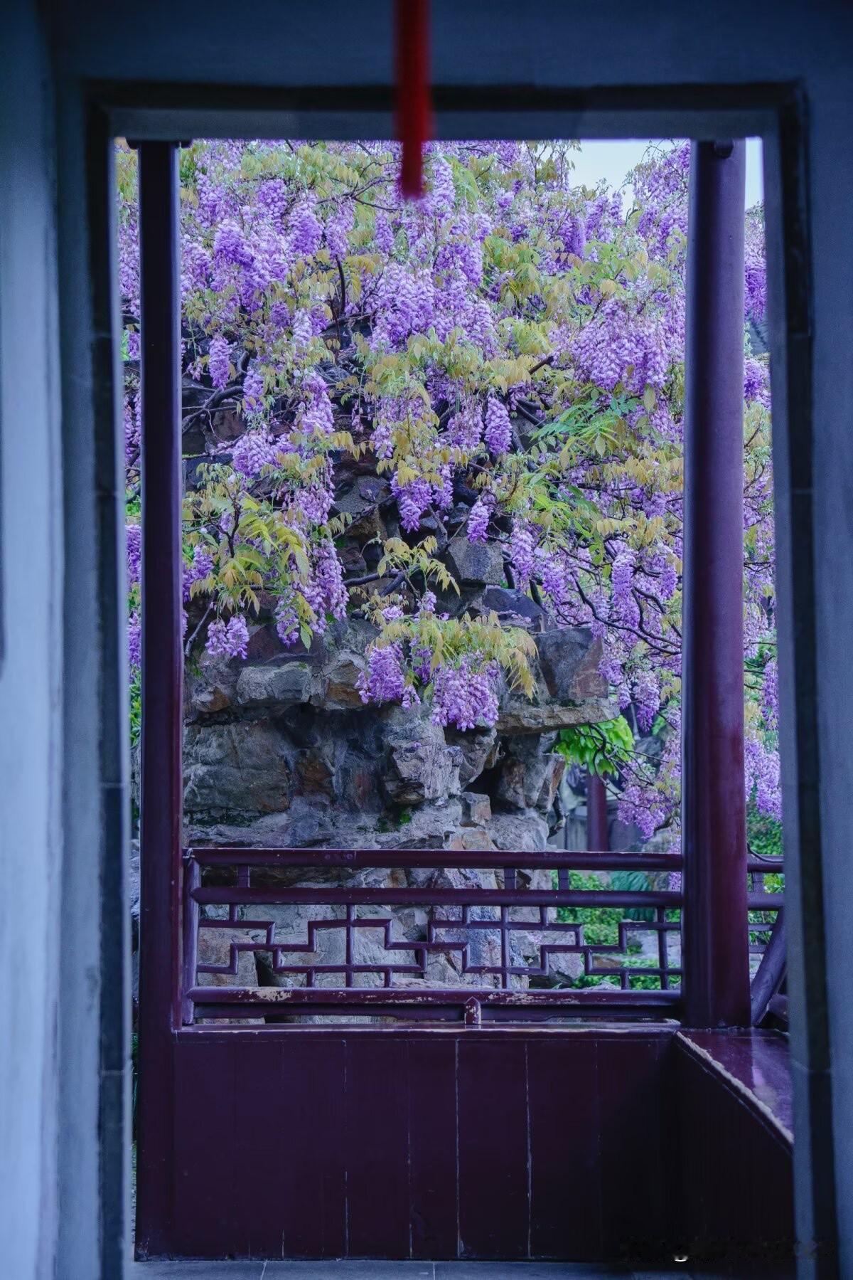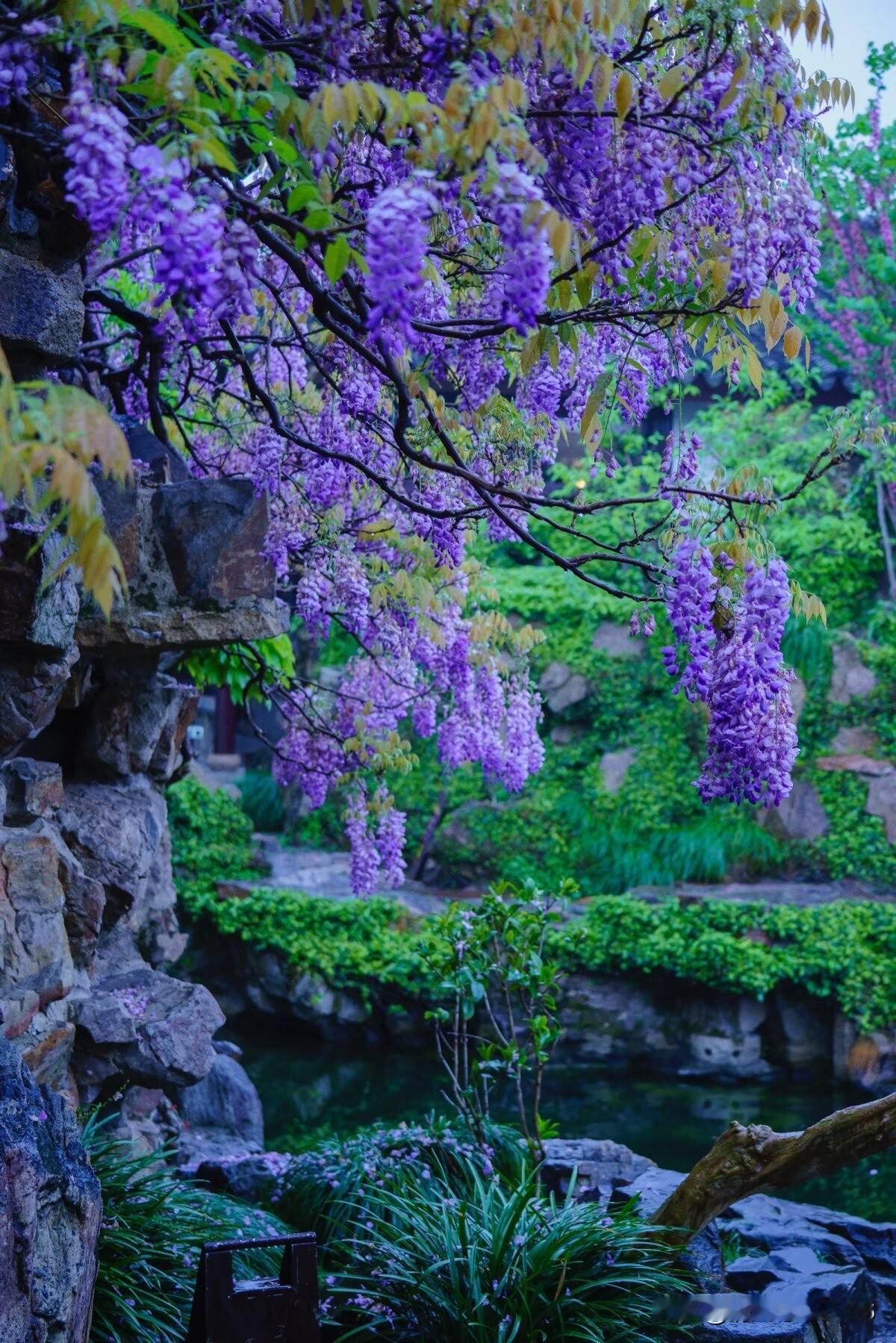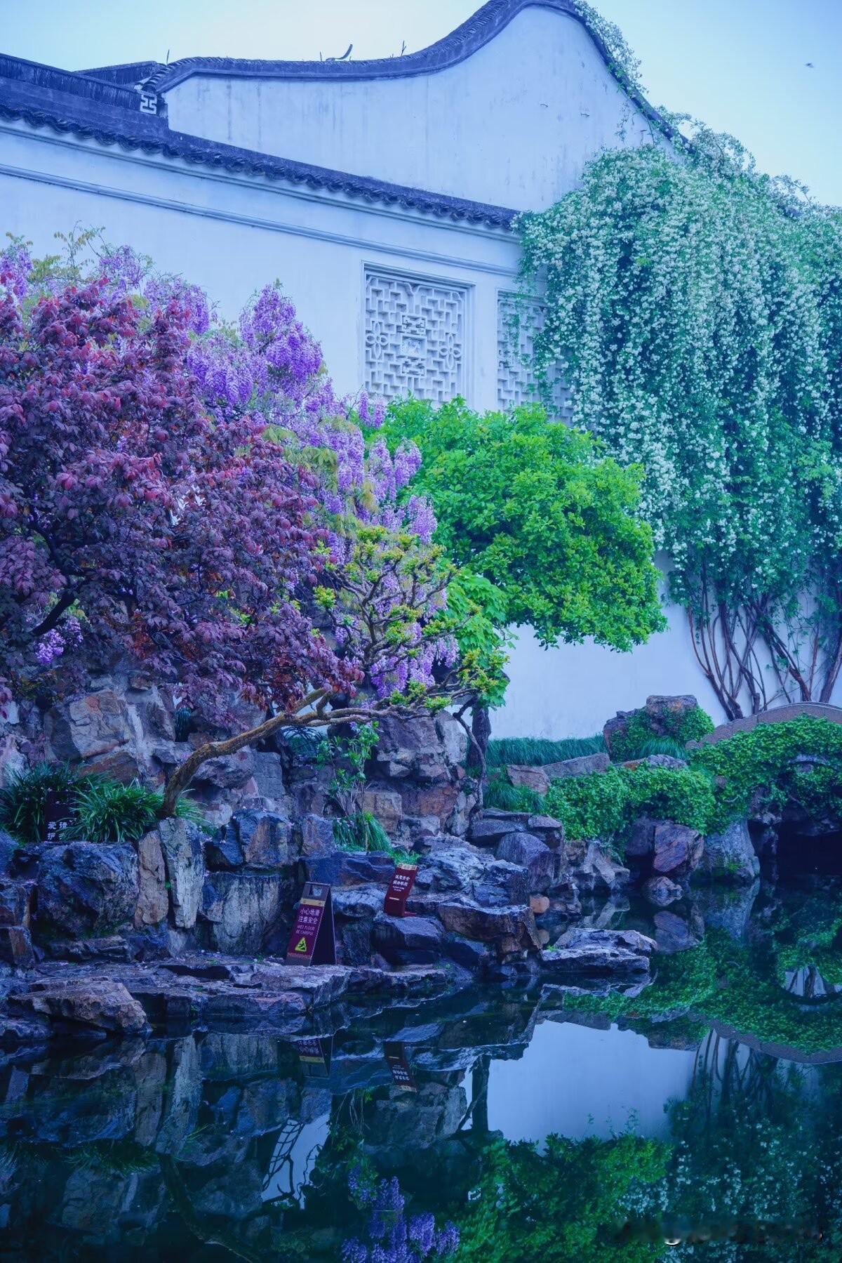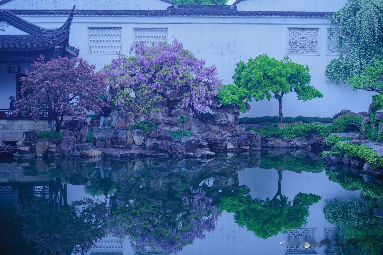 不必辗转寻觅,不必曲径寻幽,一入园便与繁花相逢。紫穗垂檐,柔蔓拂水,古建沉稳,花色温柔,大气之中藏着精巧,烂漫之间透着清雅。风过处,花影轻摇,水光微动,一静一动,皆是江南独有的诗意。