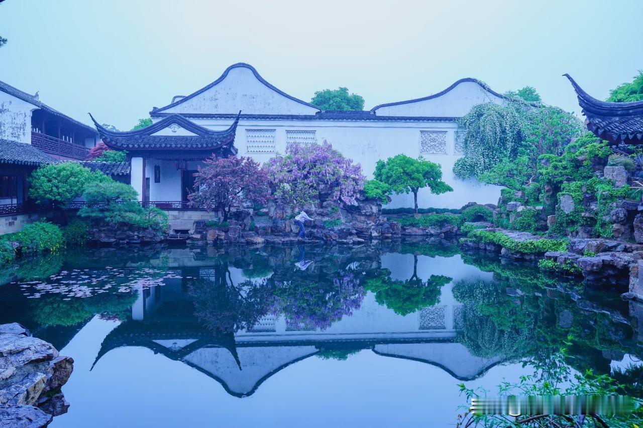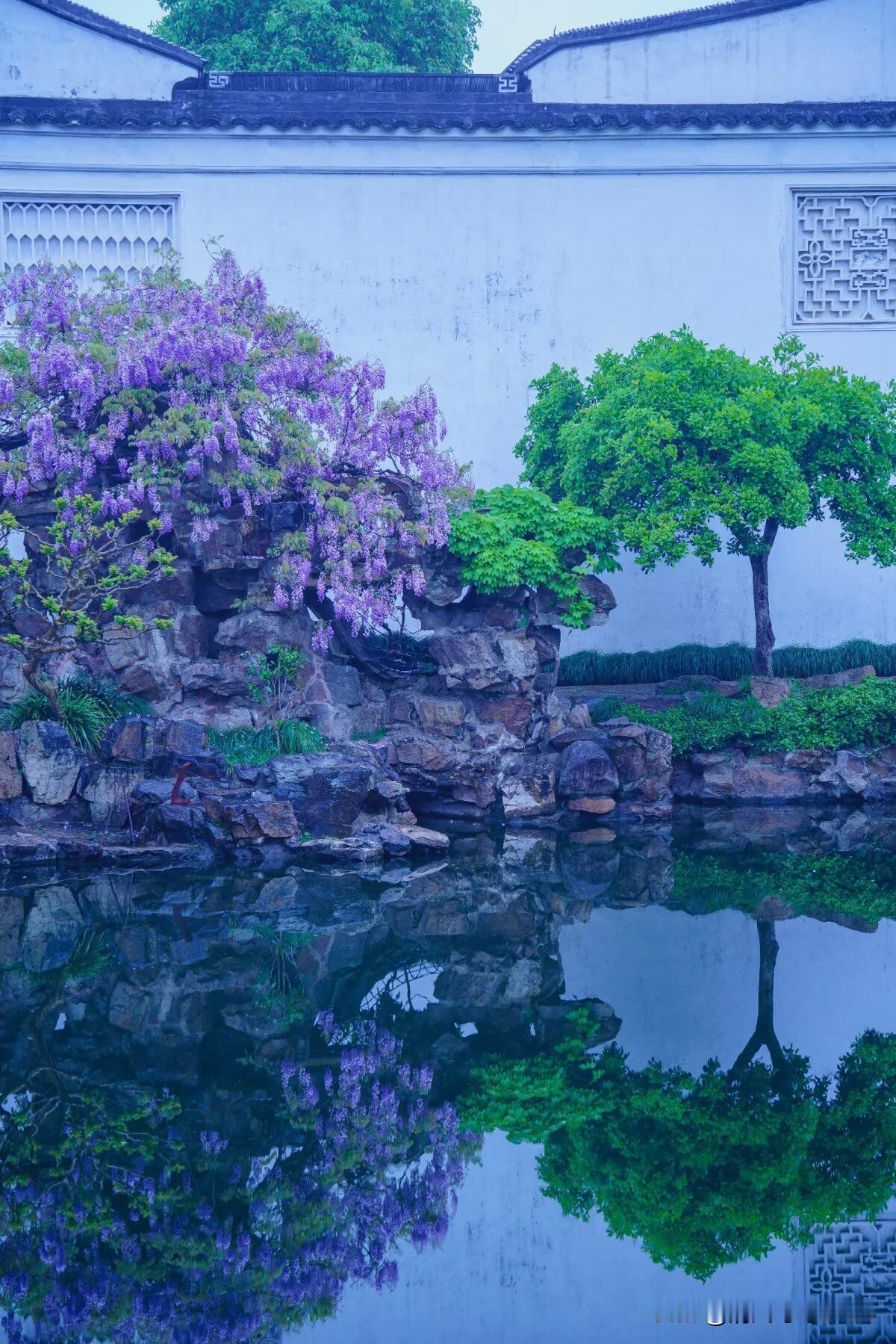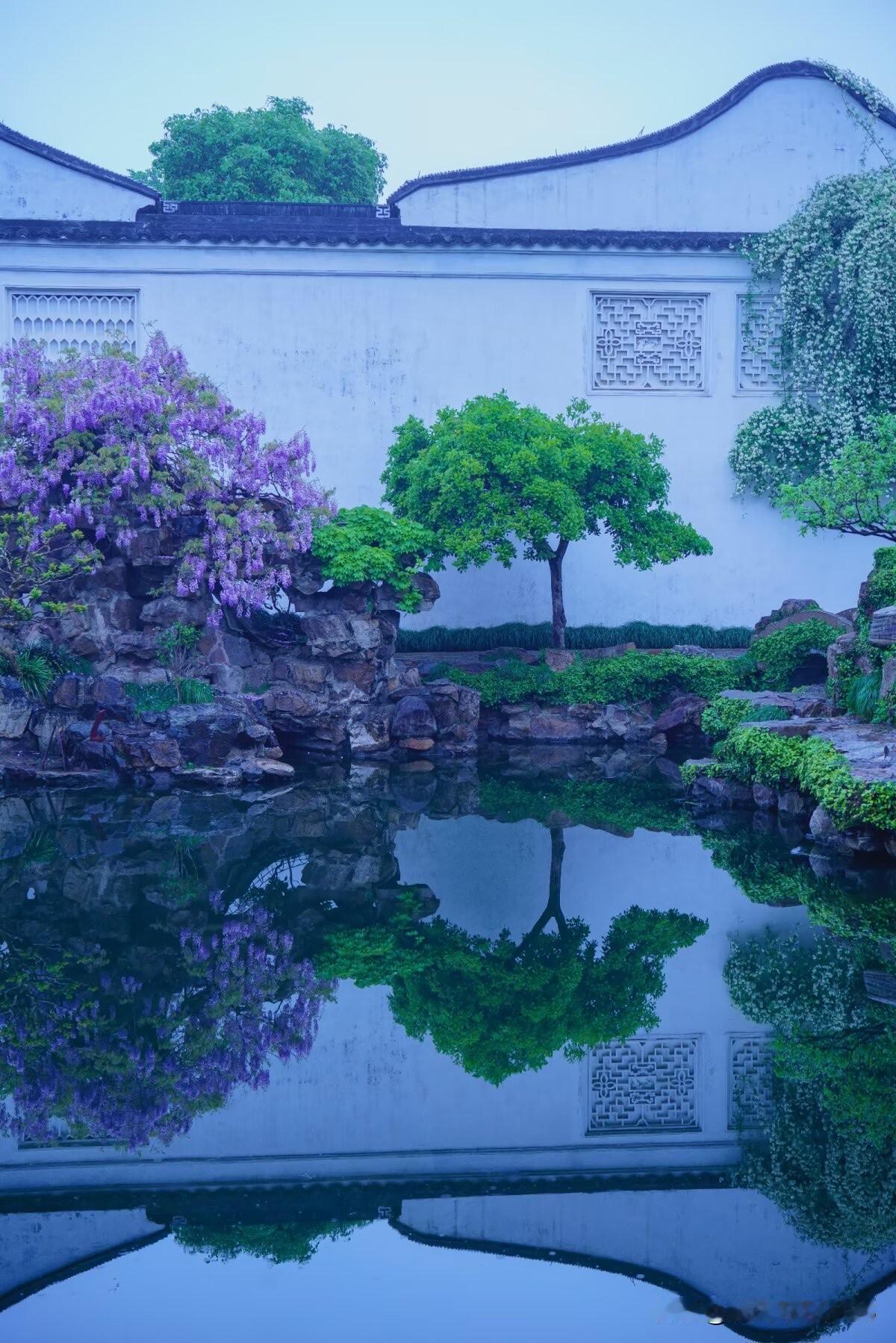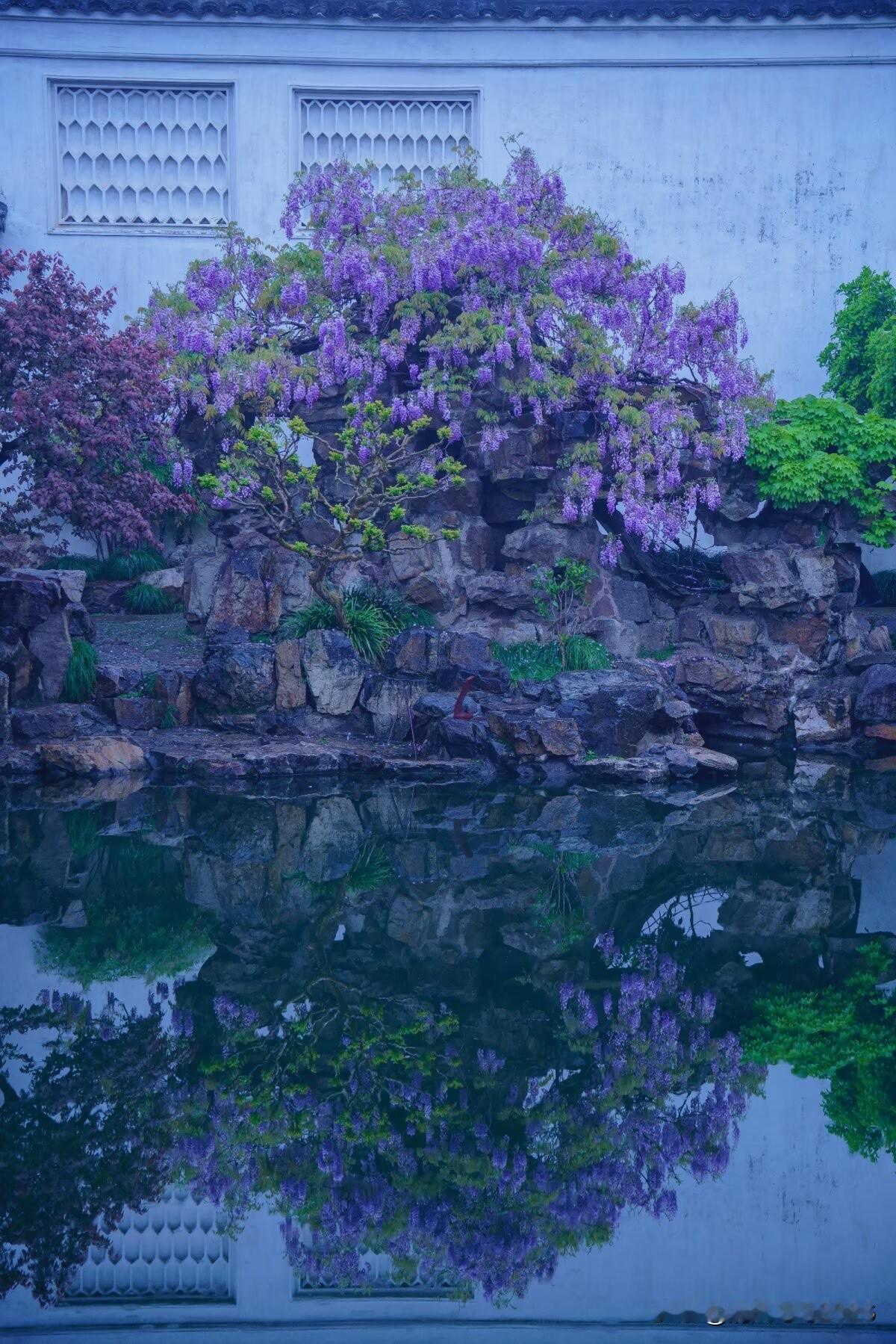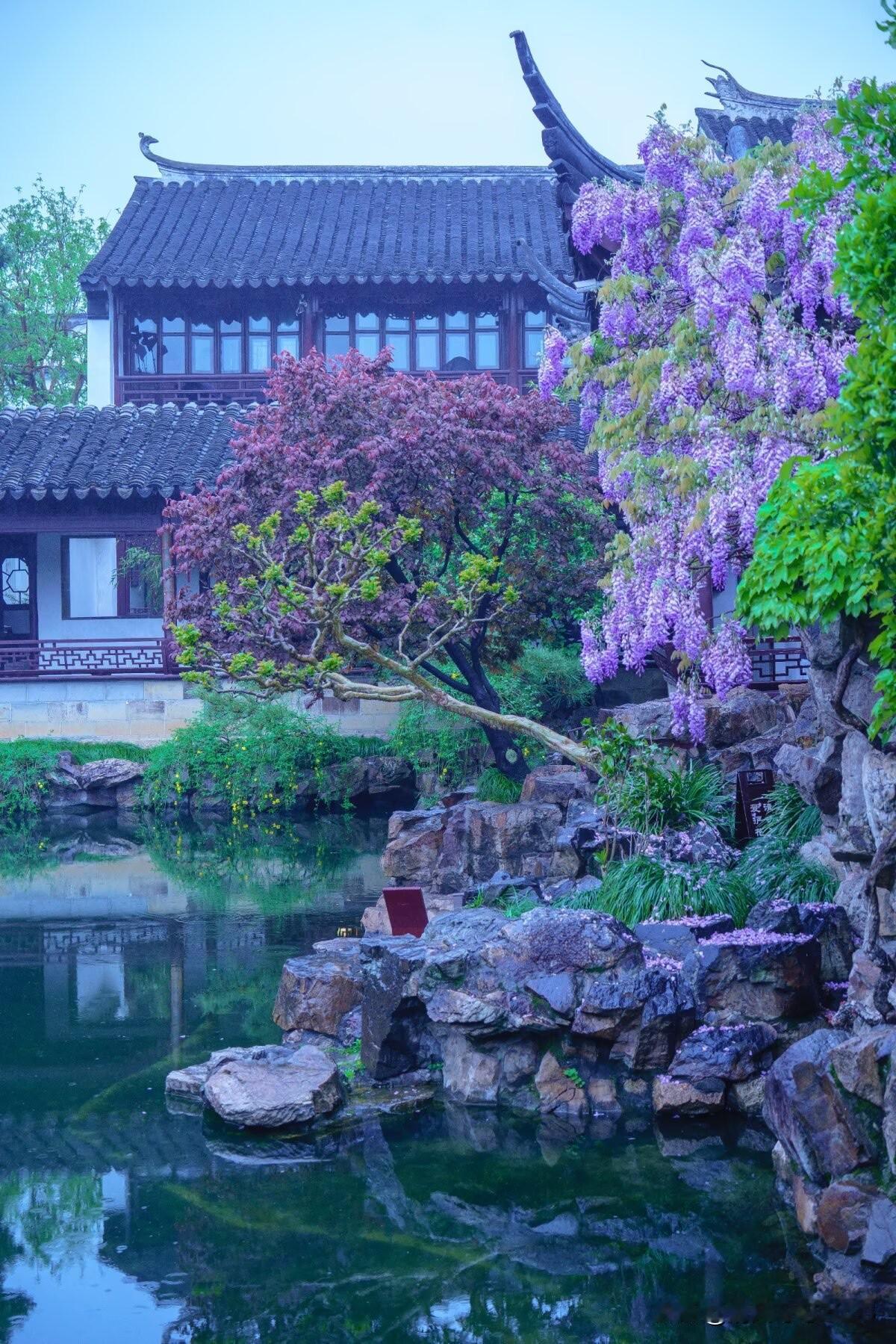 不必辗转寻觅,不必曲径寻幽,一入园便与繁花相逢。紫穗垂檐,柔蔓拂水,古建沉稳,花色温柔,大气之中藏着精巧,烂漫之间透着清雅。风过处,花影轻摇,水光微动,一静一动,皆是江南独有的诗意。