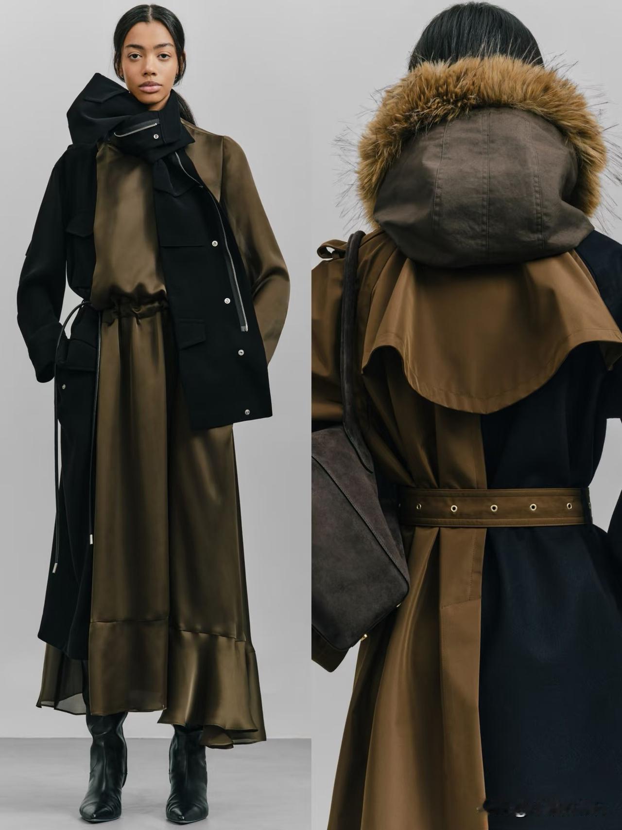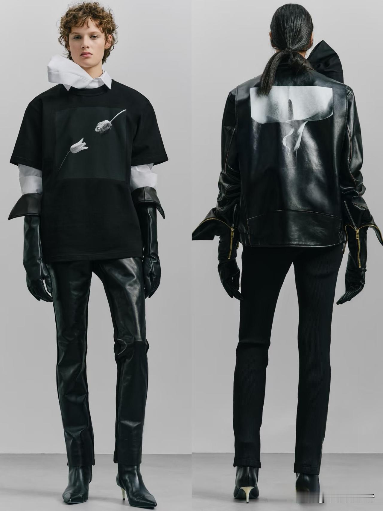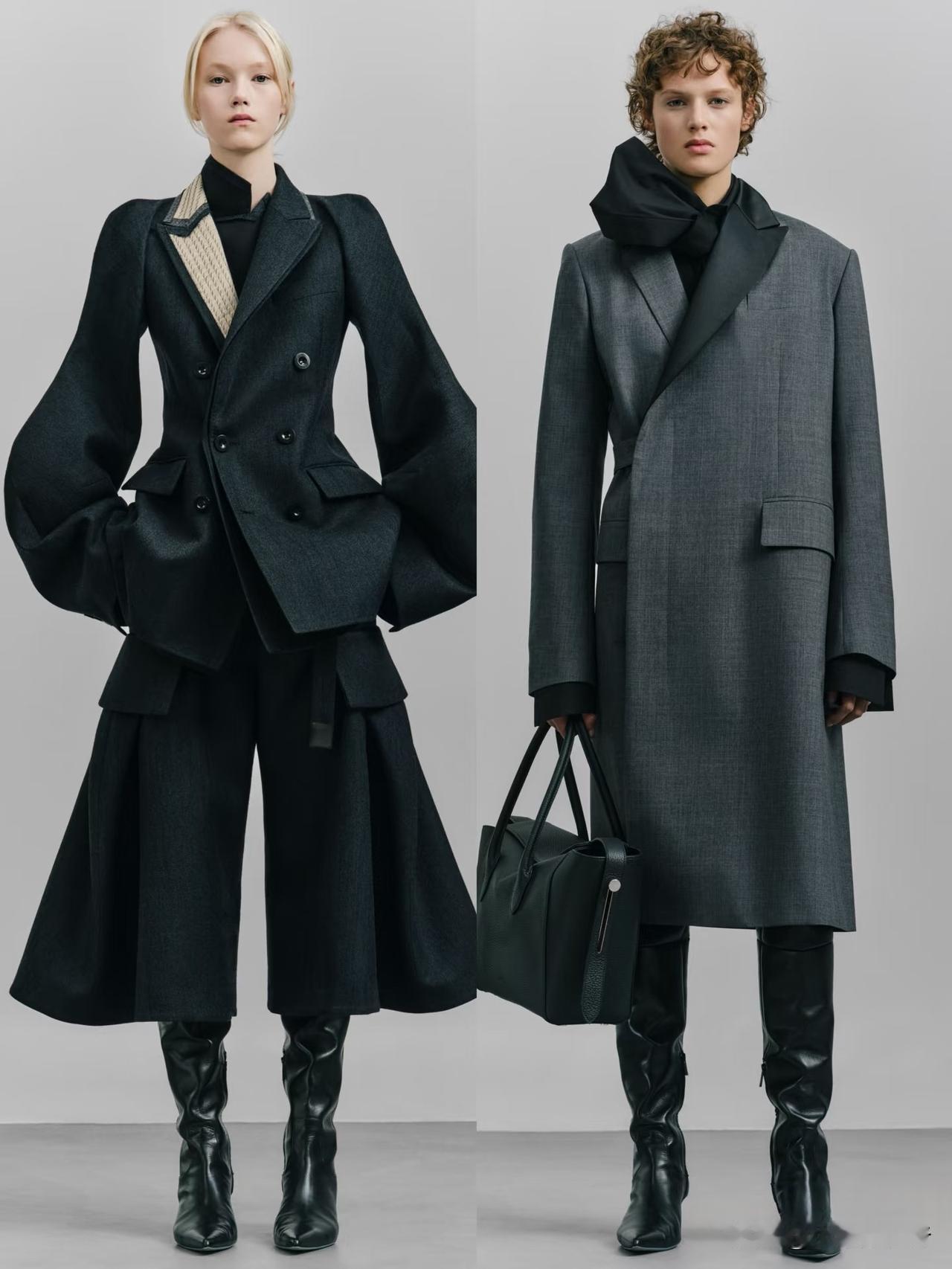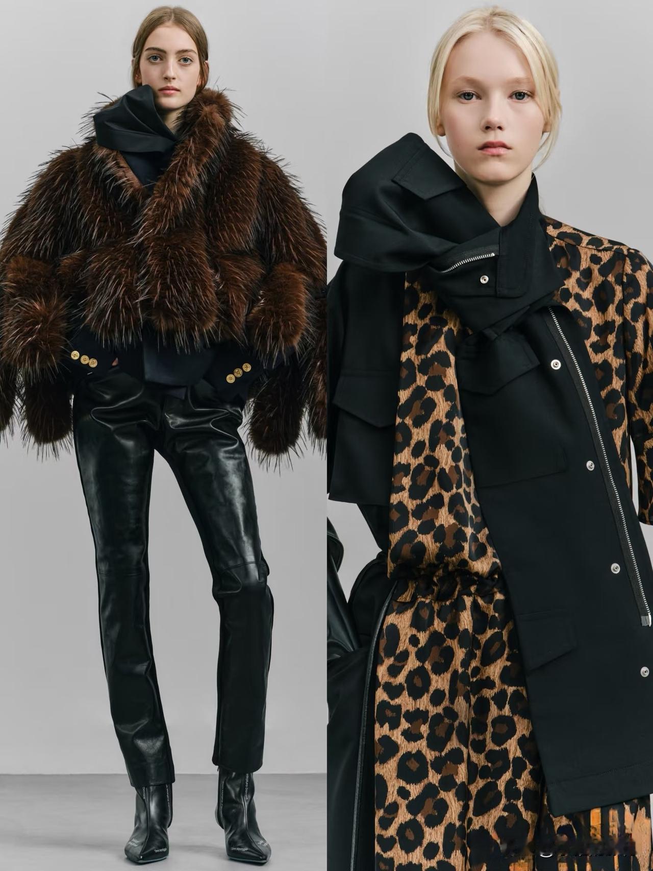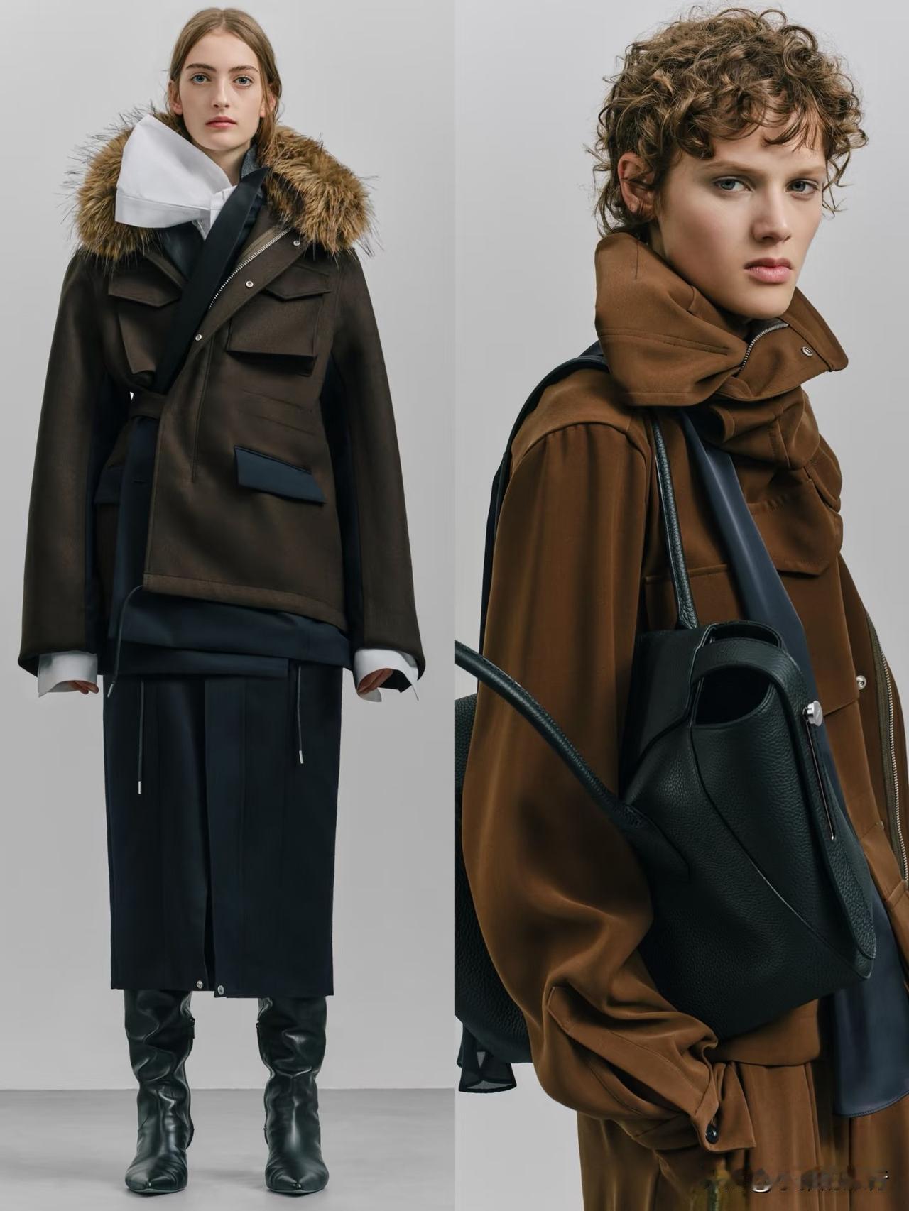 本季大量运用羊毛、皮革、牛仔与轻薄面料混搭,层次丰富却不显臃肿。不对称剪裁、拼接撞色、叠穿肌理,让每一套造型都充满动态张力。冷调大地色与深邃暗彩交织,兼具街头酷感与高级时装质感。