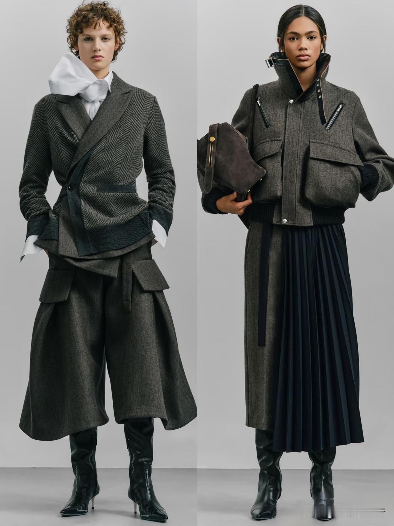 SACAI 2026秋季成衣系列,延续品牌标志性的解构美学,在剪裁与材质碰撞中,打造极具辨识度的秋冬造型。设计师以利落线条为基底,将西装、风衣、针织与裙装结构巧妙拆解重组,打破性别与风格边界。