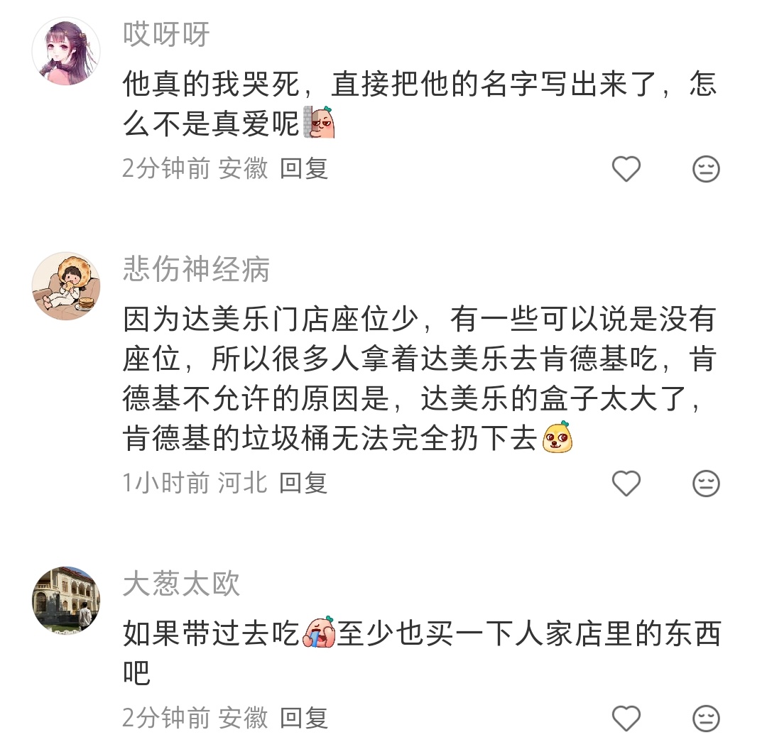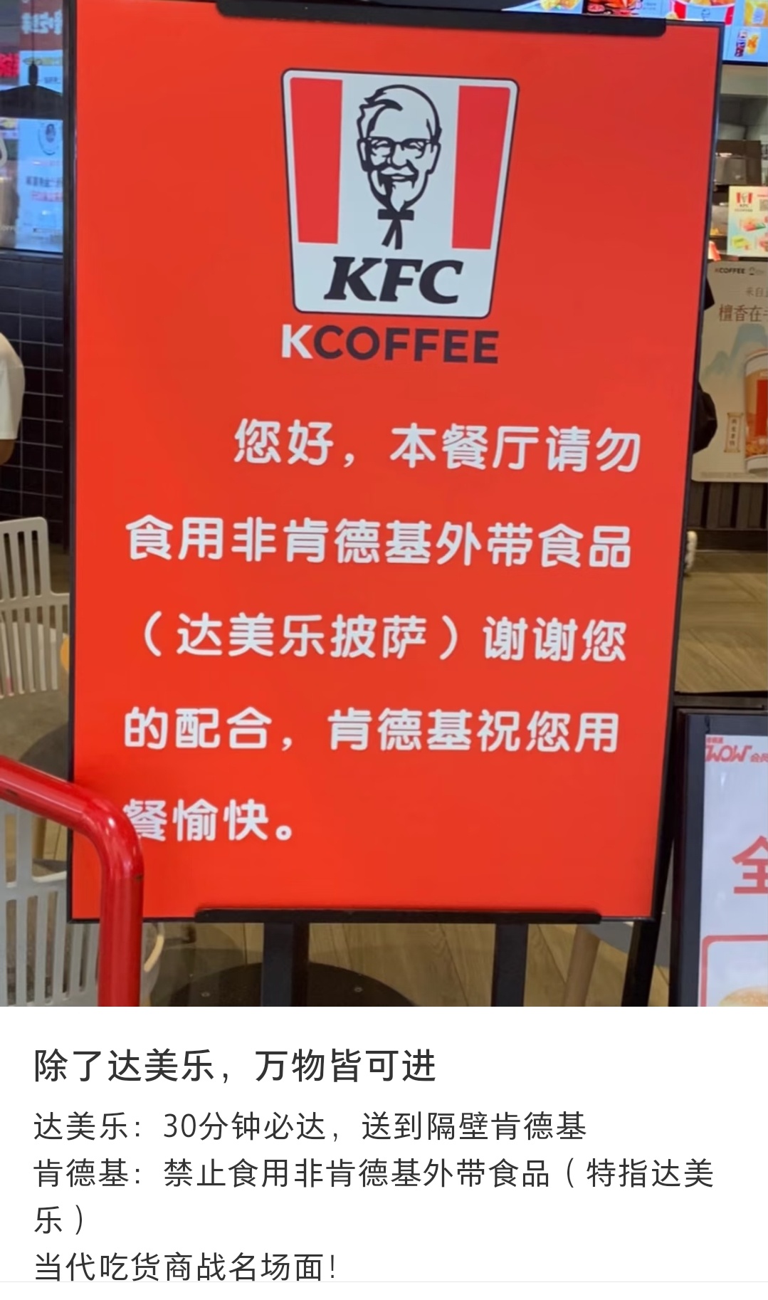 我们小县城没有达美乐,但是很早就看到过吐槽。达美乐喜欢开在他们隔壁,然后很多人就会带去肯德基麦当劳吃。披萨的盒子太大了,非常占垃圾桶,导致他们直接立牌子表示不欢迎