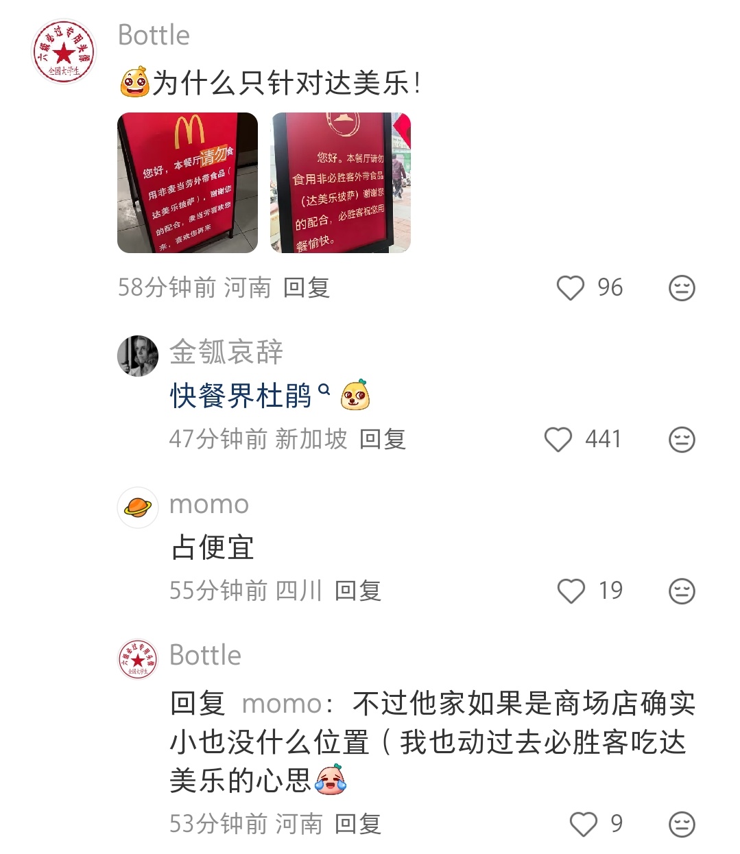 我们小县城没有达美乐,但是很早就看到过吐槽。达美乐喜欢开在他们隔壁,然后很多人就