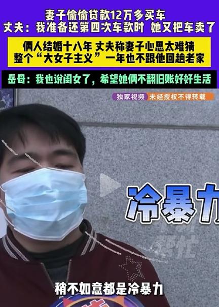 这就是大女子主义?河南洛阳,妻子悄悄网贷12万购买了一辆车,还不起贷款了才告诉男子。男子没办法,只能咬牙偿还贷款,结果,刚还了三期贷款,妻子又悄摸摸的把车卖掉了,完全没跟他商量过。男子委屈道:结婚18年,妻子稍不如意就对他冷暴力,他猜了18年都没能猜透妻子的心思。更夸张的是,岳父母明知女儿做的不对,也只来一句:我们劝说过闺女,但她不听。