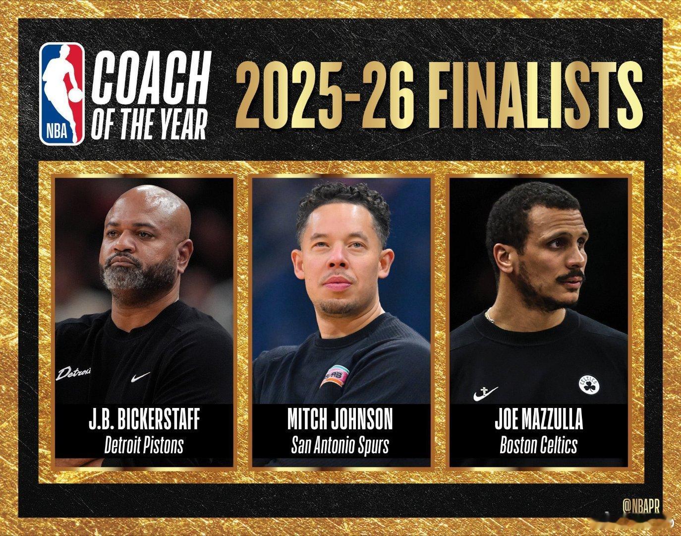 年度最佳教练J.B. 比克斯塔夫,底特律活塞米奇·约翰逊,圣安东尼奥马刺乔·马祖拉,波士顿凯尔特人NBA