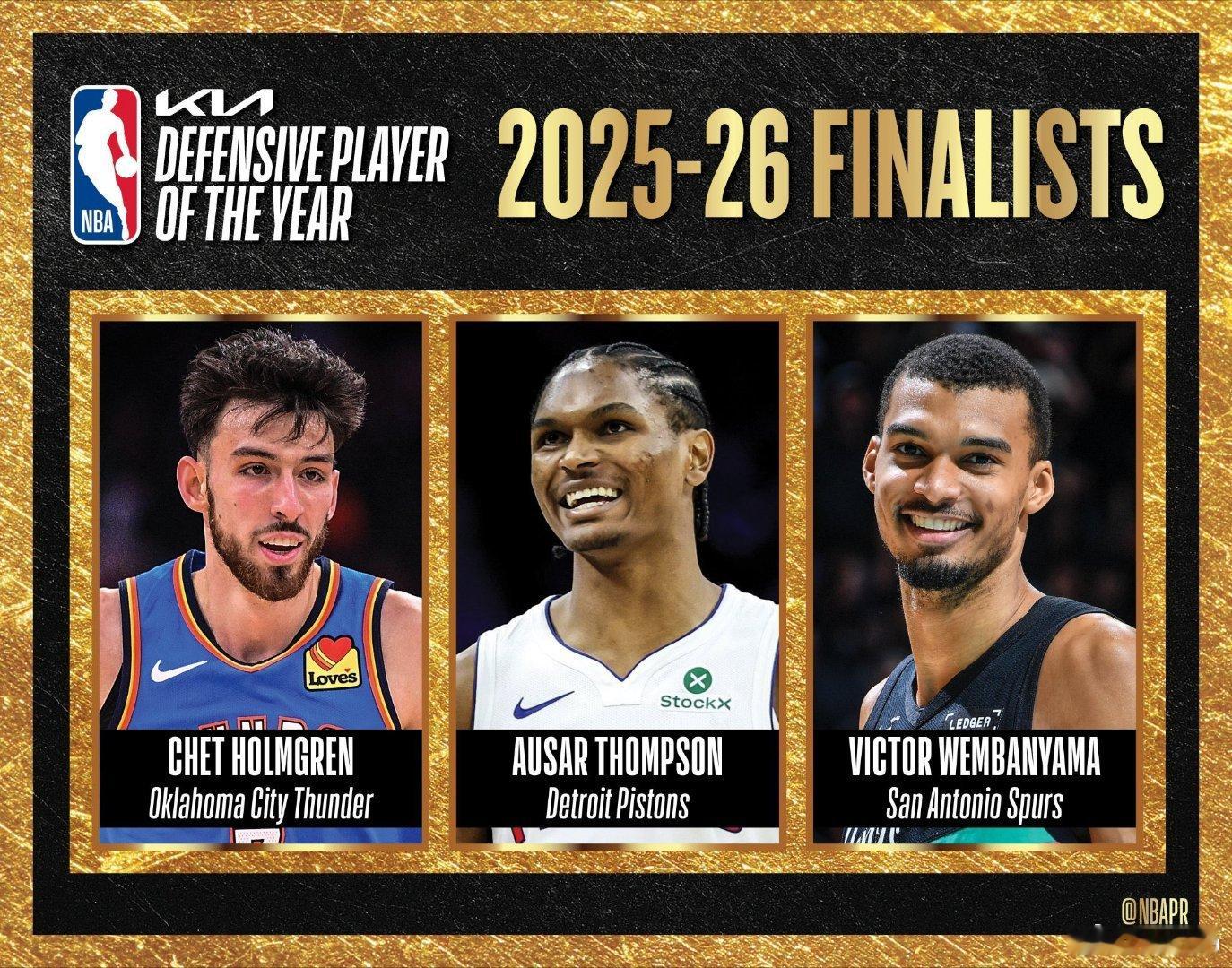 年度最佳防守球员切特·霍姆格伦,俄克拉荷马城雷霆奥萨尔·汤普森,底特律活塞维克托·文班亚马,圣安东尼奥马刺