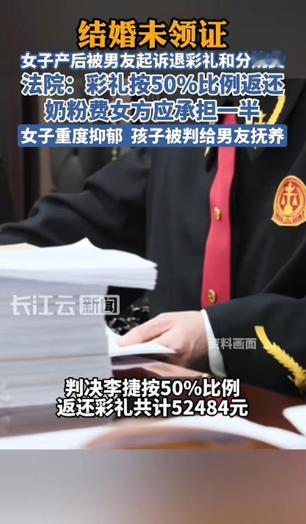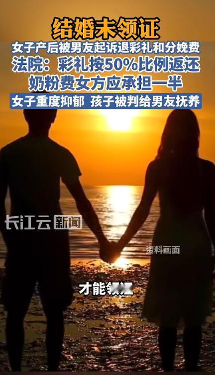 (信息来源:长江云新闻《结婚未领证,女子产后被男友起诉退彩礼和分娩费,法院:彩礼按50%比例返还,奶粉费女方应承担一半。女子重度抑郁,孩子被判给男友抚养》)