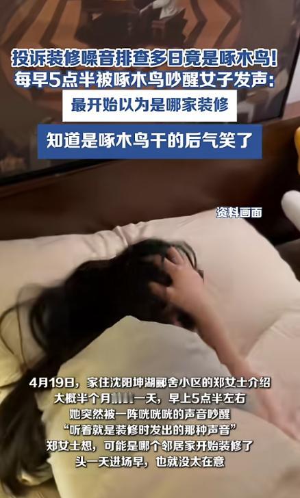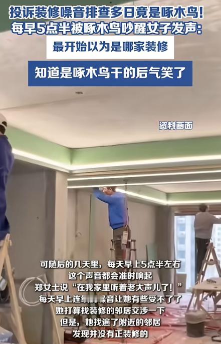 (信息来源:海报新闻《投诉装修噪音排查多日竟是啄木鸟! 每早5点半被啄木鸟吵醒女子发声:最开始以为是哪家装修,知道是啄木鸟干的后气笑了》)
