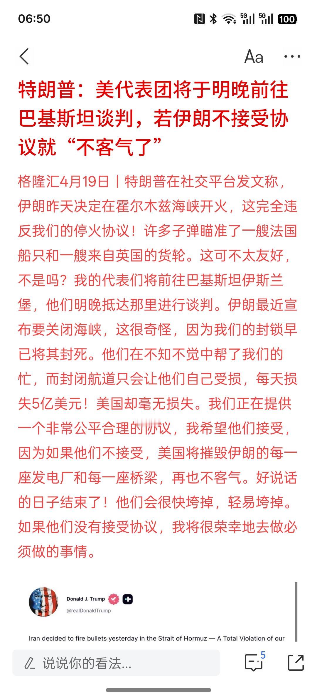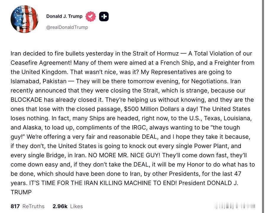 美国与伊朗准备开火!临时停火周三到期 特朗普称美伊将复谈 伊媒称拒谈!美国想要伊朗进行谈判,而美国谈判代表前往巴基斯坦,伊朗方面拒绝了与美国谈判,原因是美国不讲信用!对霍尔木兹海峡持续封锁!美国不断的在中东地区增兵,伊朗认为美国谈判代表去巴基斯坦是为了掩护美国要偷袭伊朗!而且特朗普不断的改谈判内容与规则与要求甚至不合理的要求!伊朗对美国产生了不信任!