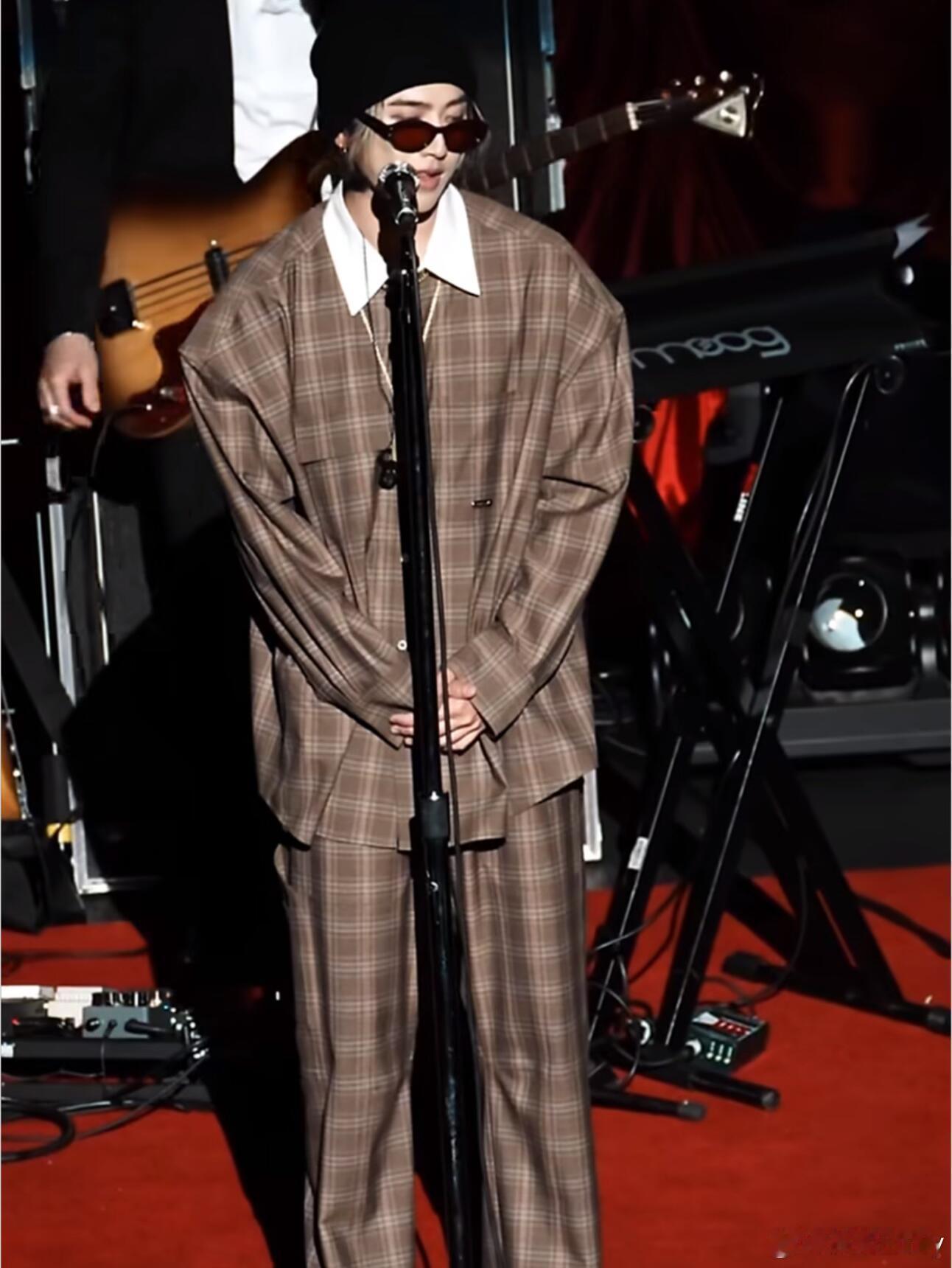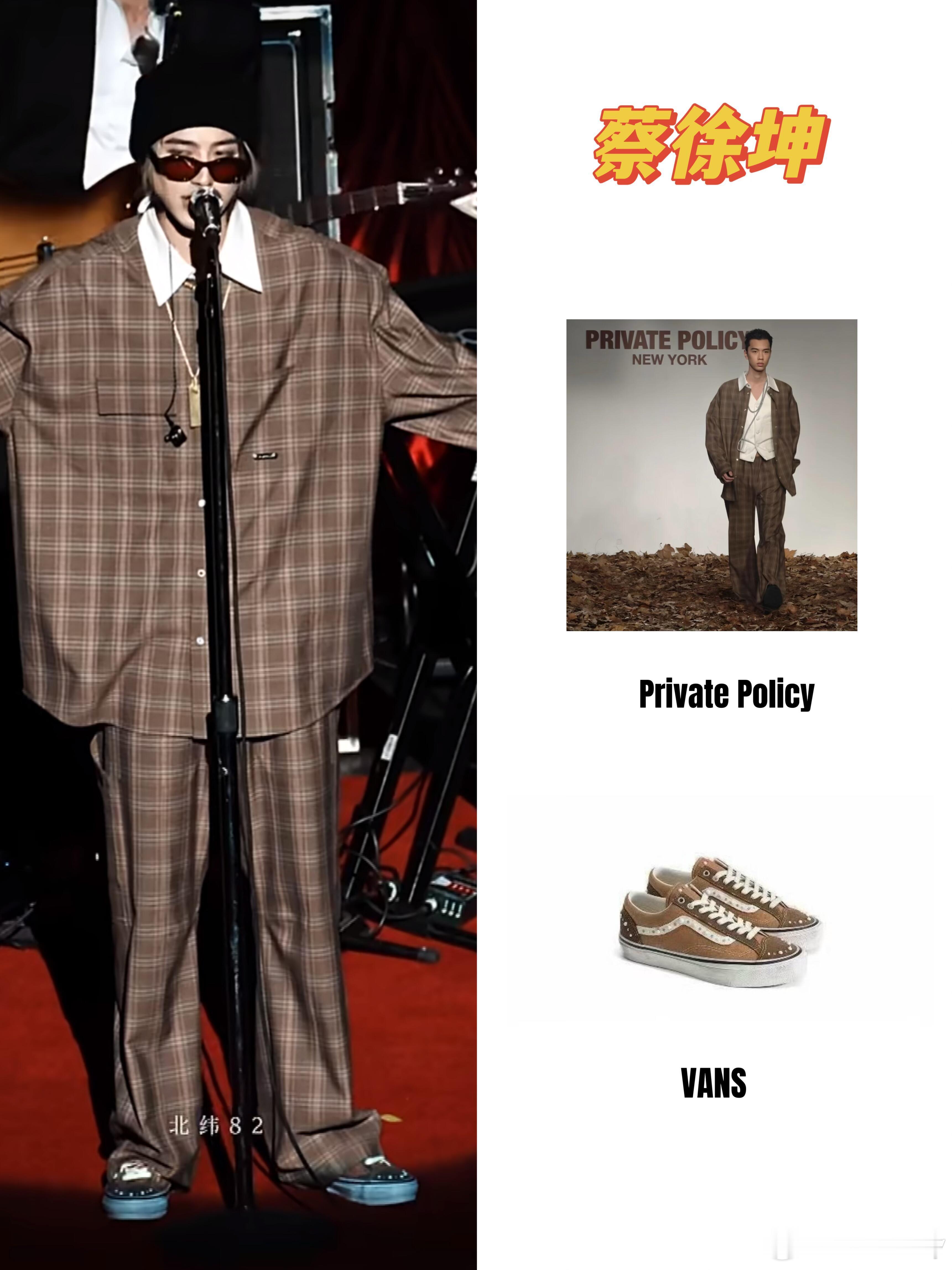 0420蔡徐坤华盛顿巡演同款穿搭上身:Private Policy 格纹西装套装,复古时髦感拉满脚踩:VANS 经典板鞋,休闲又帅气配饰:黑色帽子+墨镜,舞台气场直接封神一整身搭配又A又飒,太会穿了!
