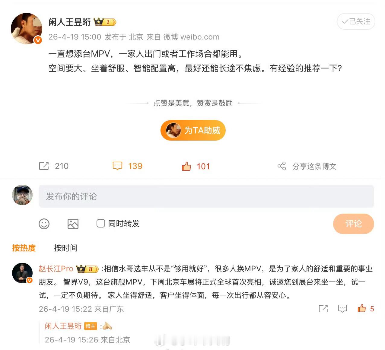 赵长江推荐水哥买智界V9水哥王昱珩想买辆MPV,要空间大、坐着舒服、智能配置高,还能跑长途不焦虑。智界汽车高管赵长江马上喊话:下周北京车展来看我们的智界V9!这车有车载制氧、恒冷大冰箱,家用商务都合适。智界V9 智驾数码团