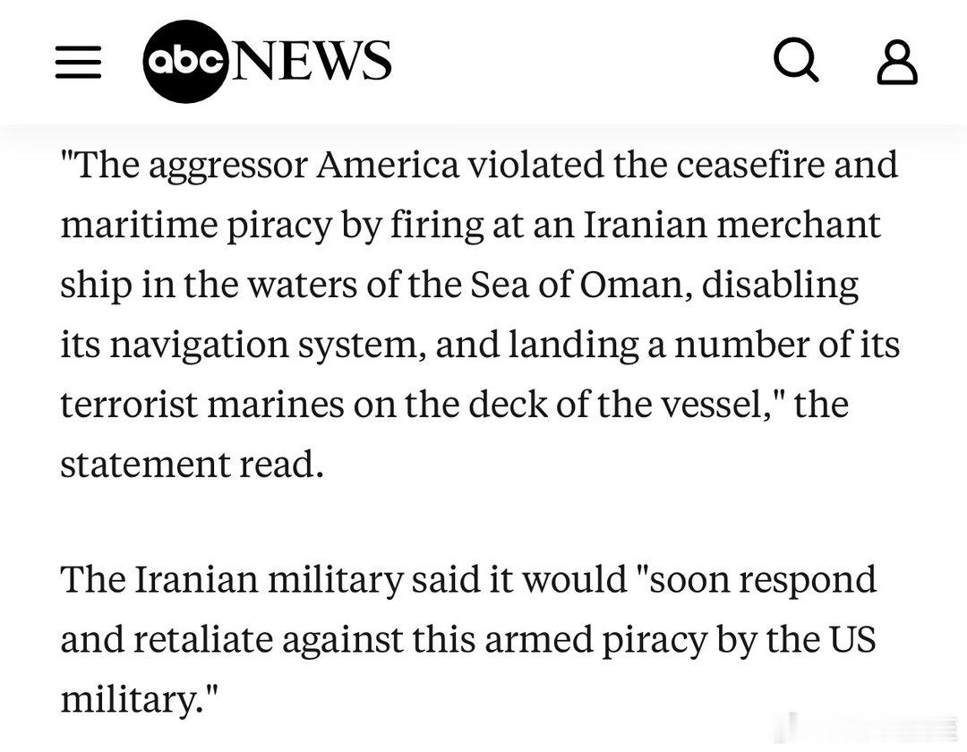 美国破坏了停火协议,朝货船开炮是海盗行为,登上伊朗船只的美军是恐怖份子…伊朗即将实施报复