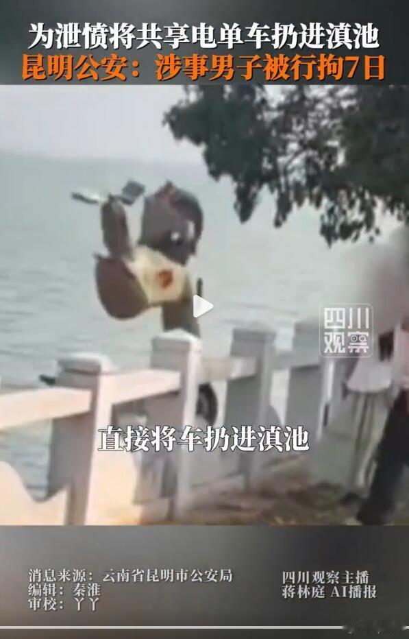 共享单车断电了,小程序卡顿,归还麻烦,这情况我在景区附近也遇到过,确实很恼火,但也不是破坏的理由啊?这也就是被人拍到了,有了铁证,所以才会被包吃住。我见过太多被故意破坏的共享单车了,要么是坐垫被刀划破,要么是被人推到沟里、河里,没被拍到就等于没事,没被抓现行就OK,只能说一些人确实比较手贱,据说多数都是摩的佬、网约车司机,觉得共享单车抢了自己的生意就去破坏,而且违法成本确实够低的。男子将共享电单车扔滇池被拘7天警方通报一男子扔共享单车进滇池男子为泄愤将共享电单车推入滇池