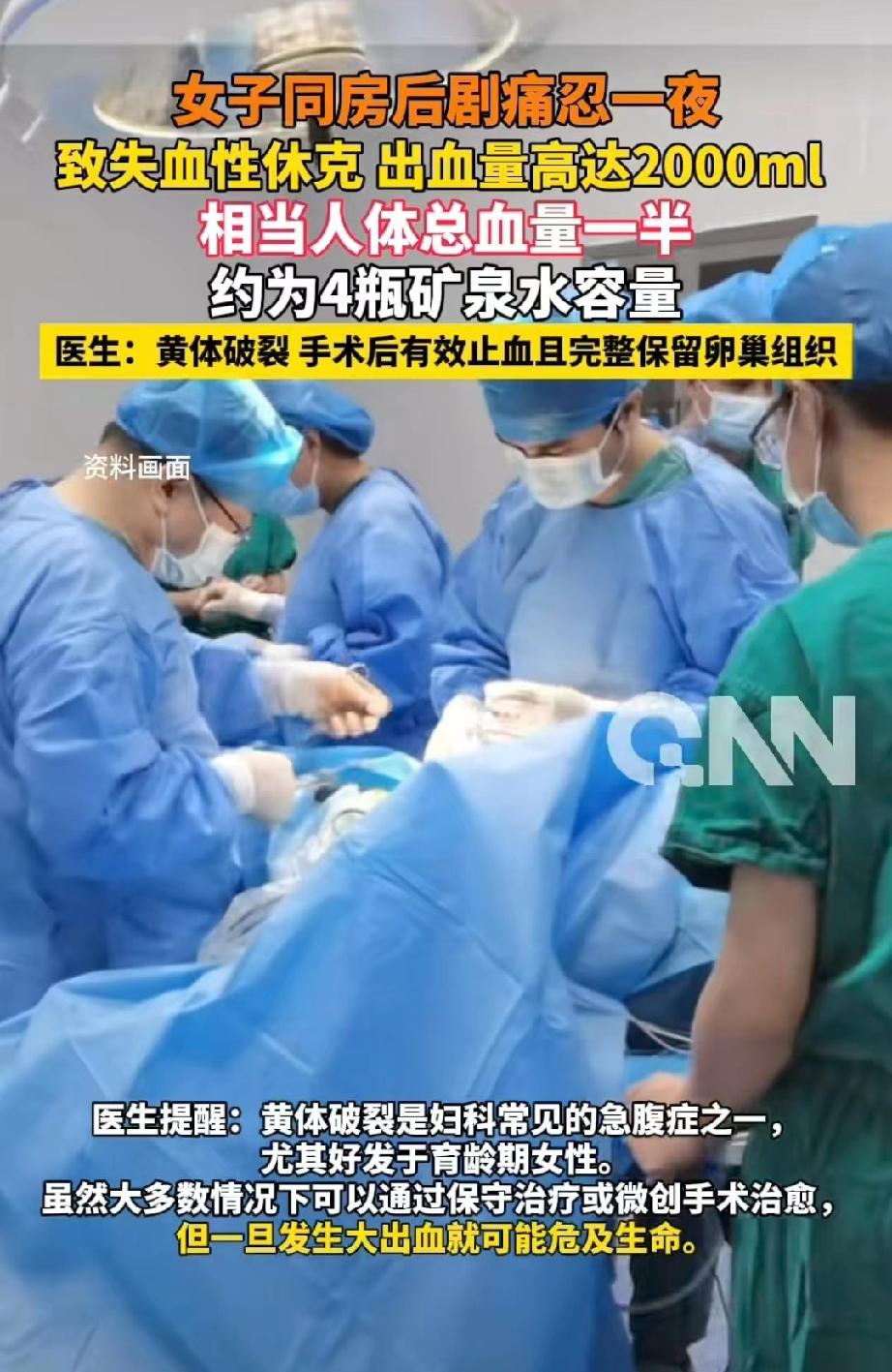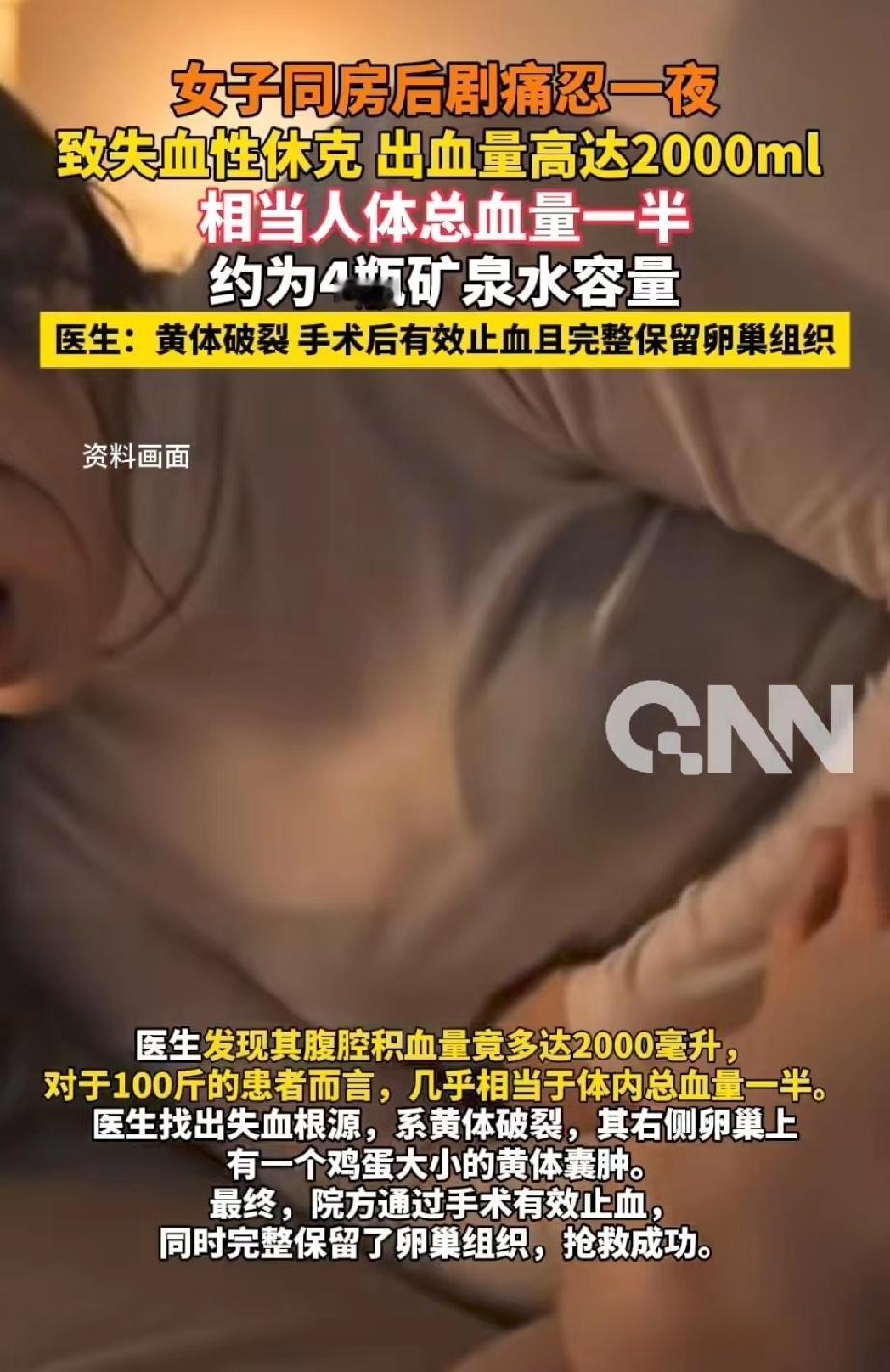 安徽,女子和男友许久未见,见面自然而然发生了亲密关系。谁知,一番恩爱结束后,女子突然腹痛难忍,本以为是动作太大,休息一下就过去了,万万没想到,第二天还疼得她浑身冒冷汗。这下男友急了,赶紧把人送到医院,医生检查发现,女子已经失血性休克,腹部出血量高达2000毫升,有四瓶矿泉水那么多。幸亏医生救治及时,才把人从鬼门关拉回来。网友∶不娶她就对不起她!