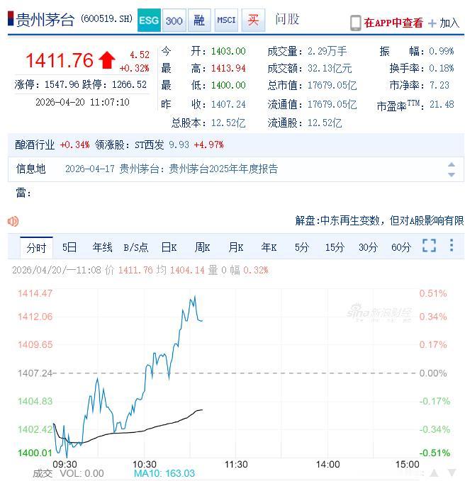 【贵州茅台重回A股股王】贵州茅台反超源杰科技 4月20日上午,贵州茅台盘中股价窄