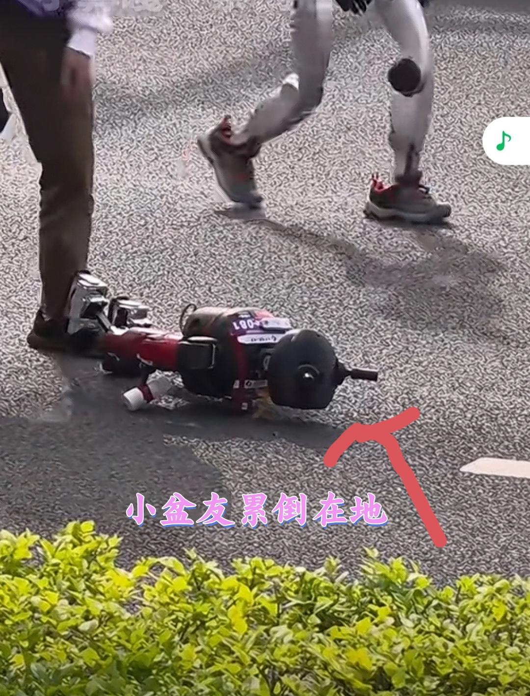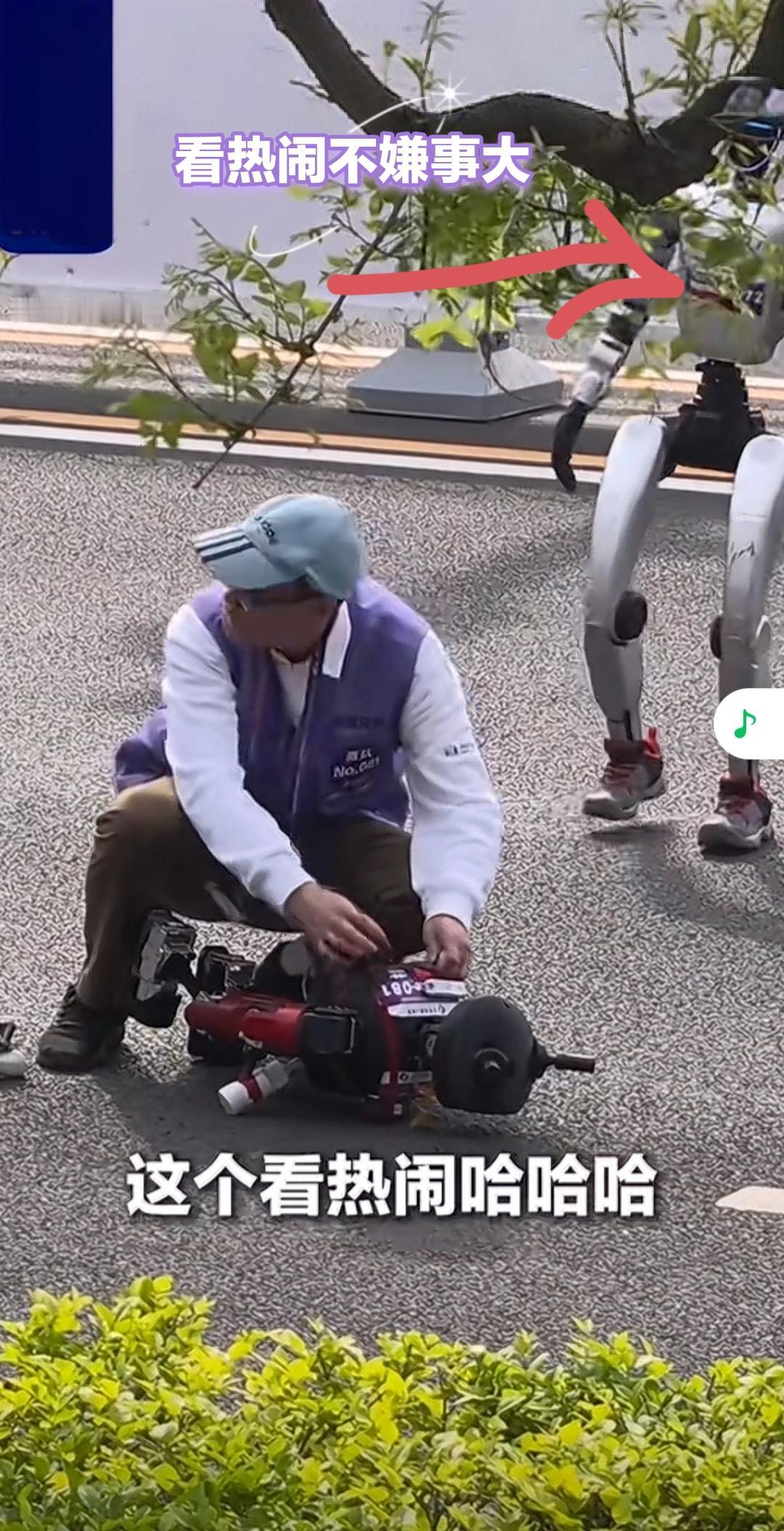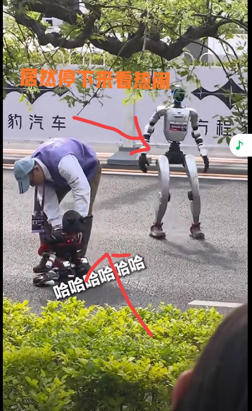 最惹人注目的是,小鼻嘎累到不行了,踉踉跄跄倒在了地上。这个时候旁边比赛的一个机器人居然停下了脚步,过来看热闹。