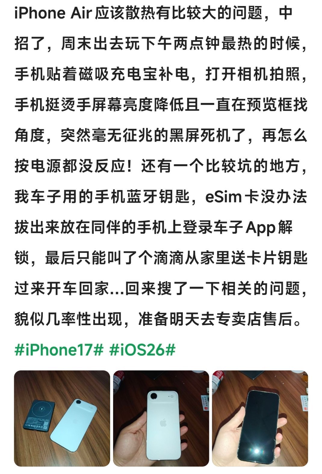 最近iPhone air烧主板的还挺多,主要原因是主板全都挤在摄像头凸起处,soc又是多层叠在一起的,导致热量散不出去影响功能
