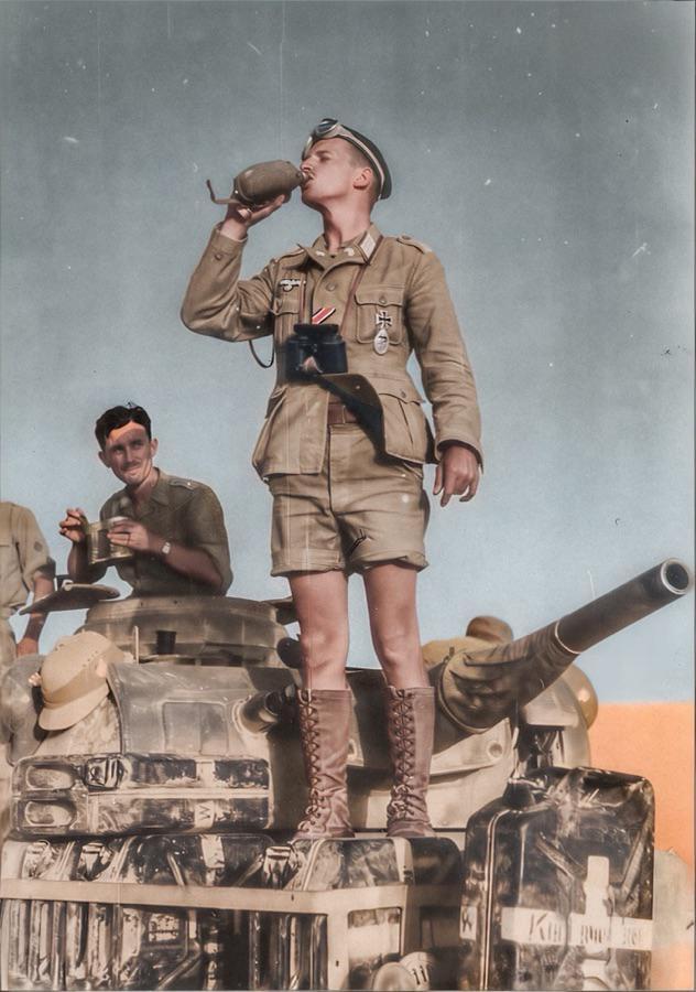 1941年初,一名隶属于德军隆美尔非洲军团的陆军装甲师军官正站在一辆三号坦克车体上高举军用水壶饮水。