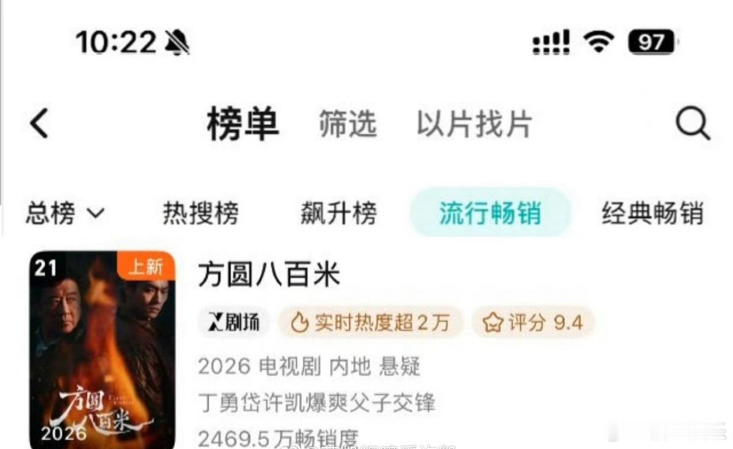许凯《方圆八百米》开播三天流行畅销榜周榜第21名,许凯陈辉好给力,演的太绝了,今晚继续来看!
