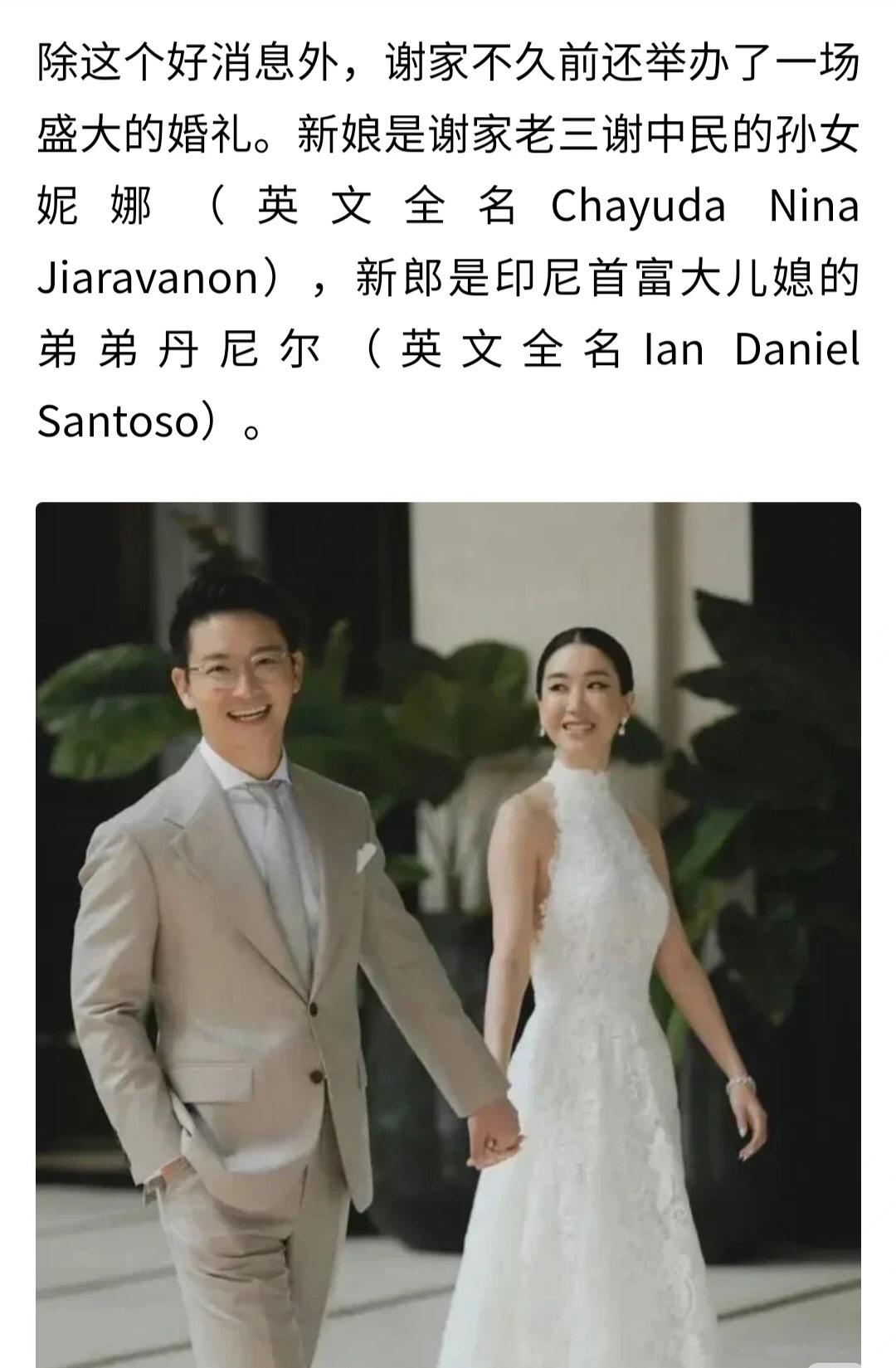 泰国正大集团除了董事长谢国民之外,他的三个哥哥也是常年霸占泰国富豪榜前十。谢国民的三哥谢中民长子谢展,他的女儿妮娜与印尼富豪之子结婚还请了印尼总统出席。