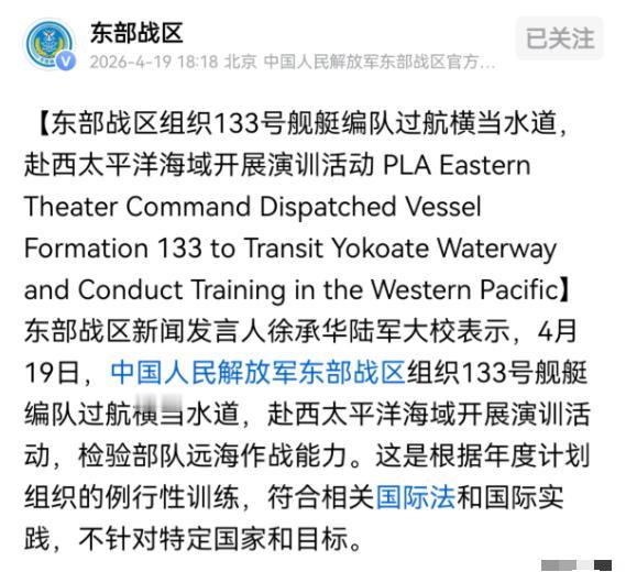 就在日方挑衅台海仅三天后,4月19日,东部战区新闻发言人徐承华大校正式官宣:133号舰艇编队顺利过航横当水道,赴西太平洋海域开展年度例行实战化演训。