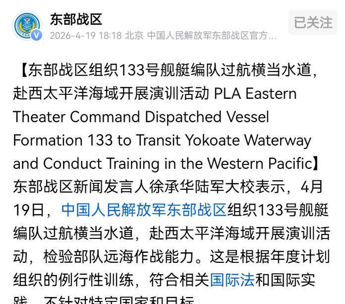 4 月 19 号东部战区突然发布消息,133 号 052D 导弹驱逐舰已经率领水上编队通过了日本西南侧的横当水道。