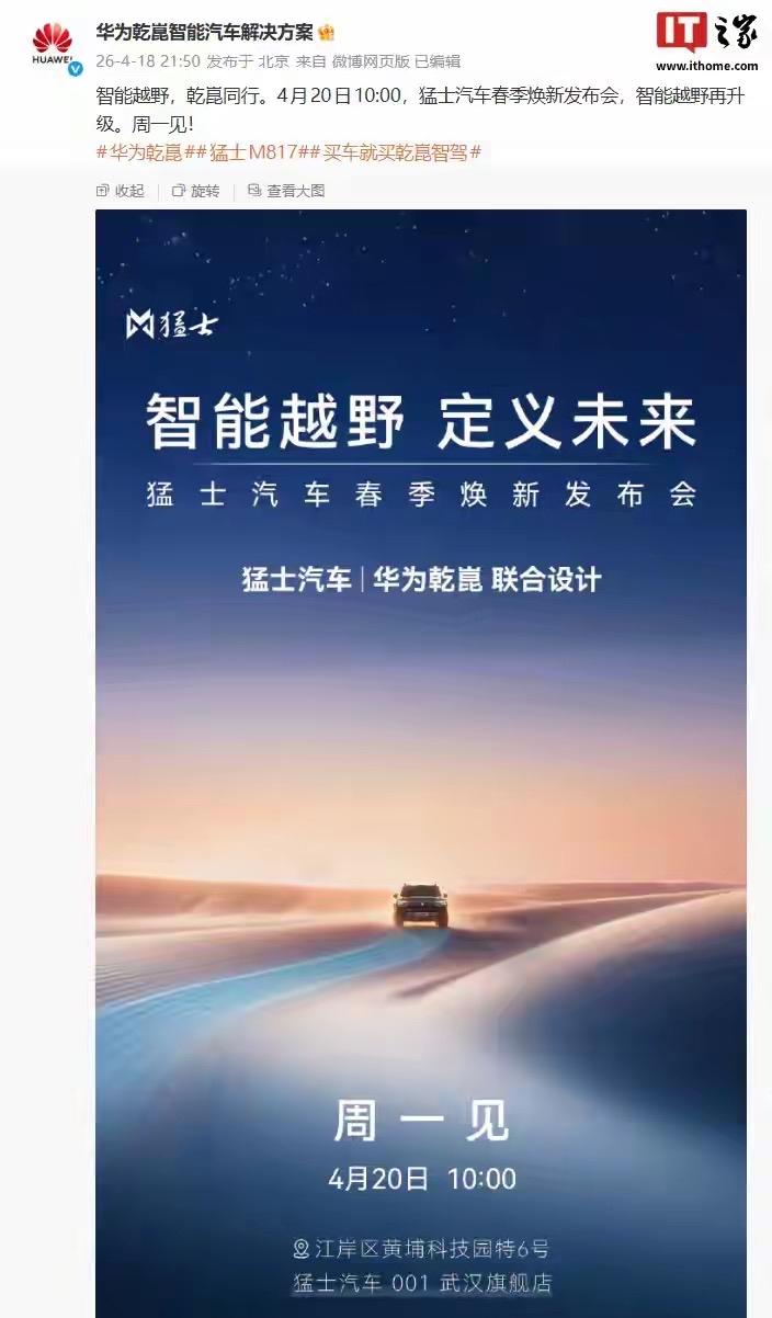 从技术共创到产品落地,从渠道融合到生态共建,猛士与华为乾崑以强强联合之姿,彻底搅动硬派越野市场格局,告别传统越野的单一竞争,开启智能越野全新时代。