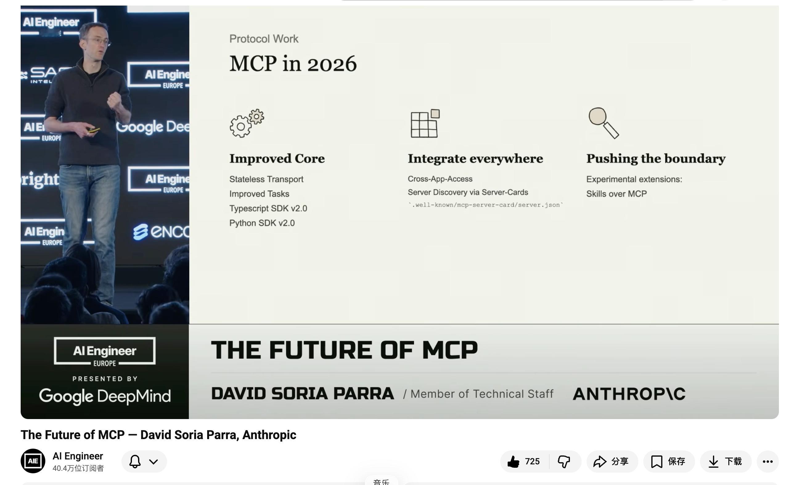 还有人在关心 MCP 吗?它的联合创建者 David Soria Parra 最近做了期分享,一些概念和趋势讲的挺好。