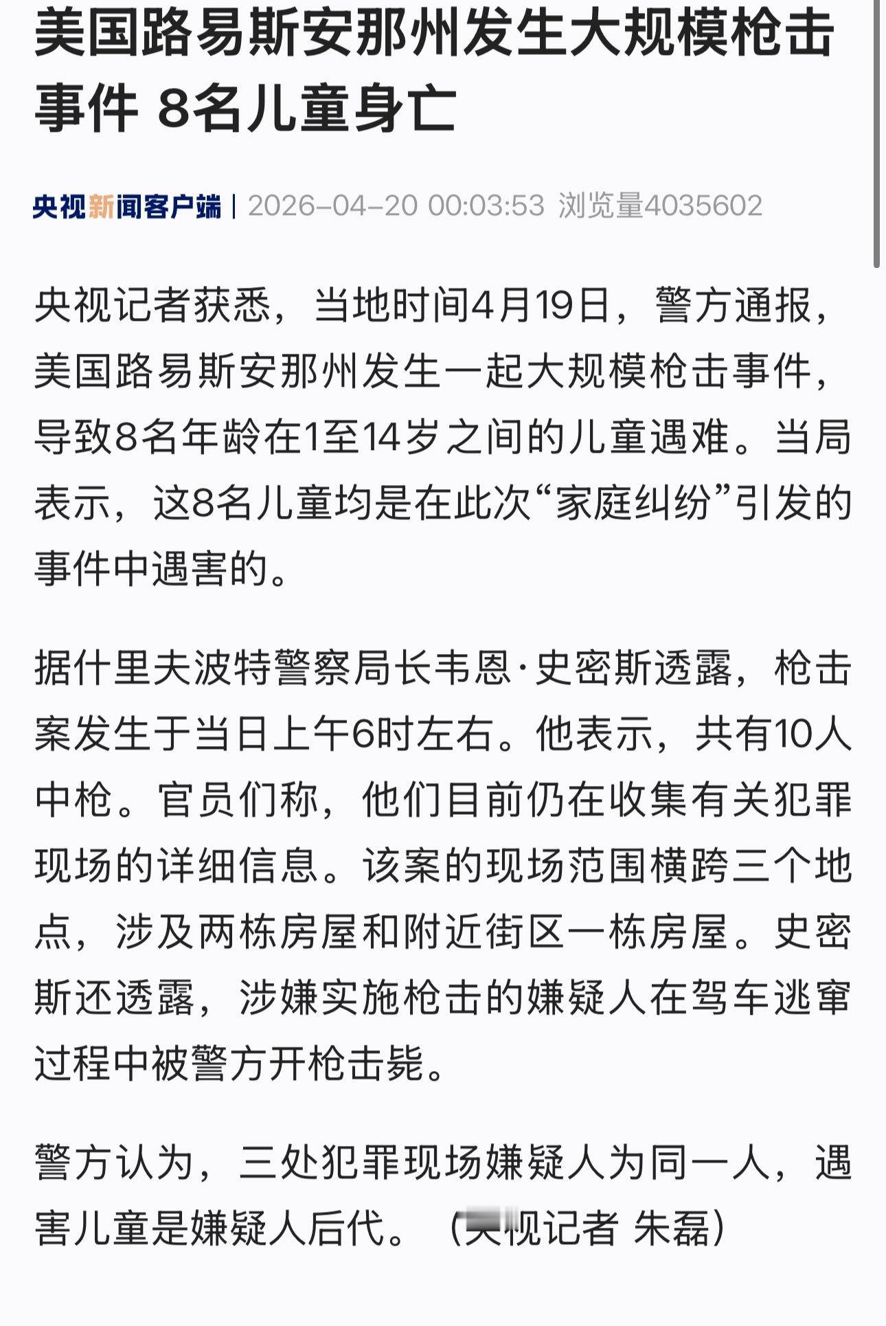 一次家庭纠纷有10人中弹其中8名1岁至14岁的儿童死亡。这几个儿童,还是犯罪嫌疑人的后代嫌疑人有国民警卫队服役7年的经历美8名儿童因家庭纠纷被枪杀热点观点 美8名儿童因家庭纠纷被枪杀