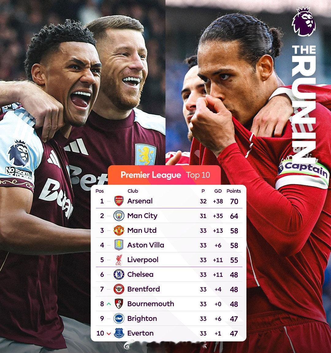 曼联和维拉,积分已经达到58分,高出第6名及之后的球队至少10分,两队基本锁定前五,拿到下赛季欧冠名额。利物浦则是保五争三,命运掌握在自己手中(PS:拿到欧冠名额,斯洛特还会下课吗?)。