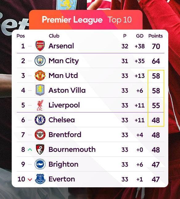 【英超争五大局已定!切尔西看人脸色】英超第33轮,几支争五球队,曼联、维拉、利物浦和伯恩茅斯赢球,切尔西和埃弗顿输球,其他都打平。