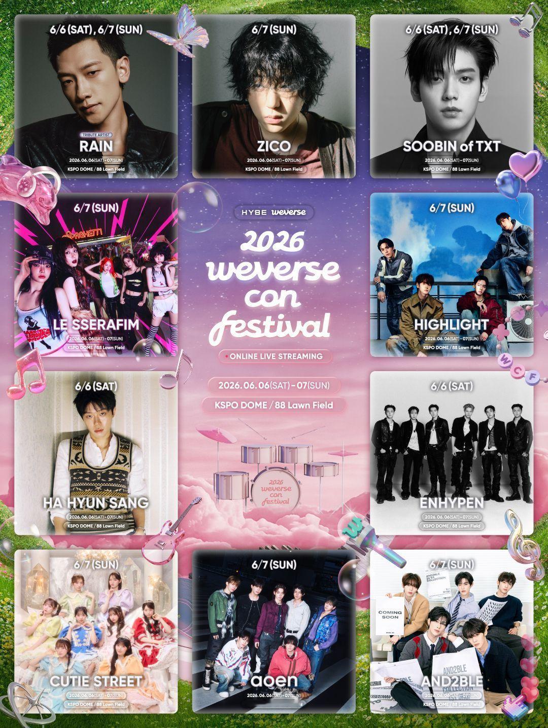 《2026 Weverse Con Festival》最终出演阵容+出演日期6月6日:RAIN、崔秀彬、夏贤尚、ENHYPEN、WENDY、QWER、PLAVE、ILLIT、AHOF、LUCY、黄旼炫、BOYNEXTDOOR、Apink、AMPERS&ONE、82MAJOR6月7日:RAIN、ZICO、崔秀彬、LE SSERAFIM、HIGHLIGHT、CUTIE STREET、aoen、AND2BLE、TOUCHED、 P1Harmony、李昌燮、CORTIS、&TEAM、尹产贺、TWS、权珍雅、金在中