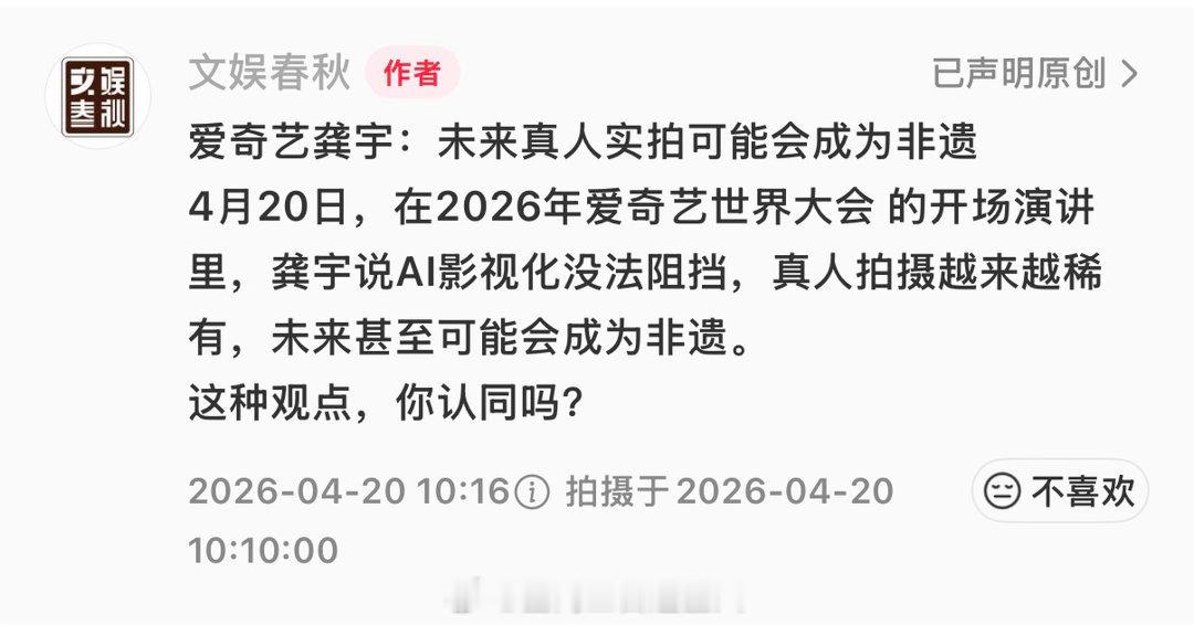 爱奇艺龚宇说真人拍摄未来甚至可能成为非遗,这么说的话传媒专业不都得关停?