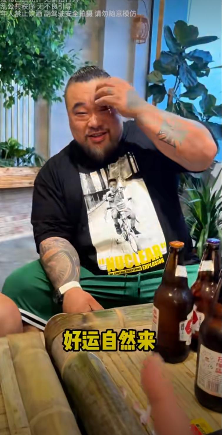 就在他那主打一碗肘子打卤面的京面儿面馆里,朋友一出手,直接拎来一瓶人头马XO当见面礼。视频里,老岳穿着黑T恤、绿裤子,坐在竹编桌椅旁,桌上摆着几瓶啤酒,本来还挺接地气的场景,突然就被这瓶酒的礼盒给镇住了。