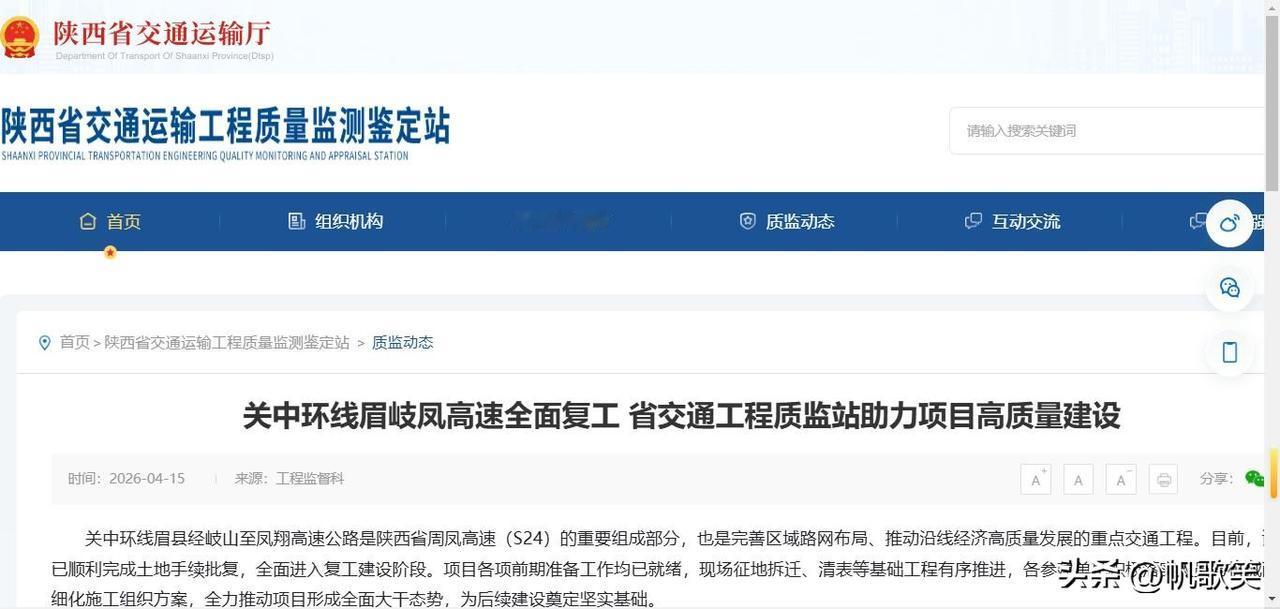 近日,陕西交通运输厅官网发布陕西省交通运输工程质量监测鉴定站《关中环线眉岐凤高速全面复工 省交通工程质监站助力项目高质量建设》,官宣关中环线(眉岐凤高速)迎来全面复工;标志着这项备受瞩目的交通工程进入新的建设阶段。