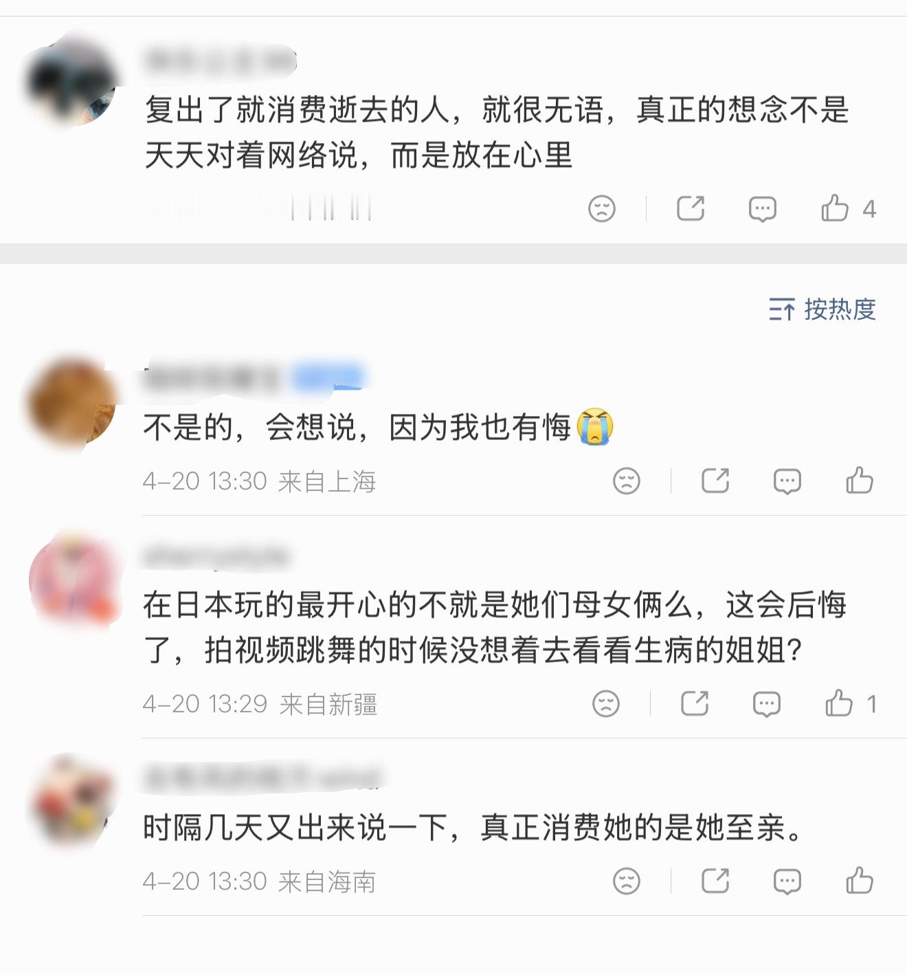有些人说话太难听,妹妹怀念下姐姐就是消费吗,有点良心的都不会冷嘲热讽吧,大s对小s有多重要不言而喻吧,表达下后悔都不行吗…小S后悔发起大S最后的日本旅行