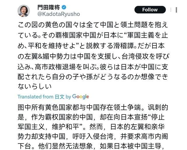 日本右翼分子门田隆将声称,中国与所有领土都存在领土争端。这个奉行“霸权主义”的中国,竟然还说教日本“停止军国主义、维护和平”,简直是滑天下之大稽。但日本的左翼及亲中势力却支持中国,纵容其“侵略”台湾,还叫嚣着要让高市政权下台。他们似乎完全无法想象,一旦日本被中国支配,自己的子孙后代会落得何种下场?