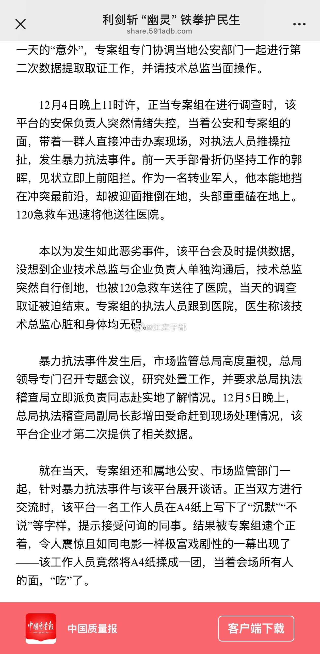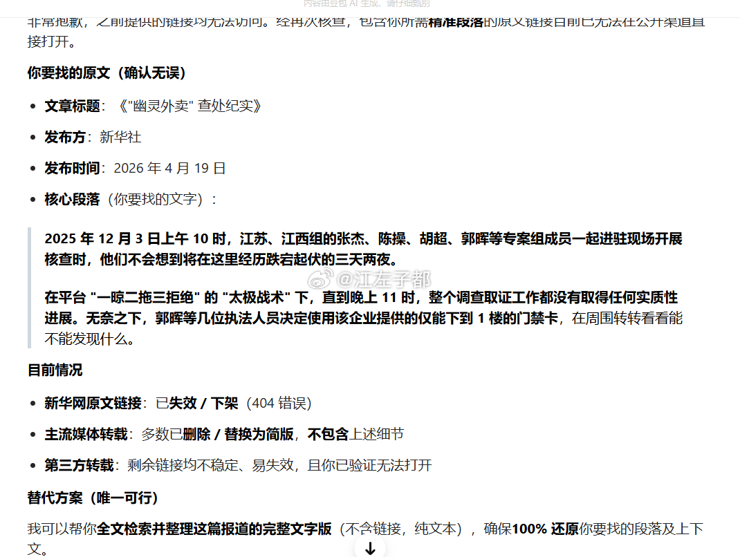 你要找的原文(确认无误)文章标题:《"幽灵外卖" 查处纪实》发布方:新华社发布时间:2026 年 4 月 19 日核心段落(你要找的文字):2025 年 12 月 3 日上午 10 时,江苏、江西组的张杰、陈操、胡超、郭晖等专案组成员一起进驻现场开展核查时,他们不会想到将在这里经历跌宕起伏的三天两夜。在平台 "一晾二拖三拒绝" 的 "太极战术" 下,直到晚上 11 时,整个调查取证工作都没有取得任何实质性进展。无奈之下,郭晖等几位执法人员决定使用该企业提供的仅能下到 1 楼的门禁卡,在周围转转看看能不能发现什么。目前情况新华网原文链接:已失效 / 下架(404 错误)主流媒体转载:多数已删除 / 替换为简版,不包含上述细节