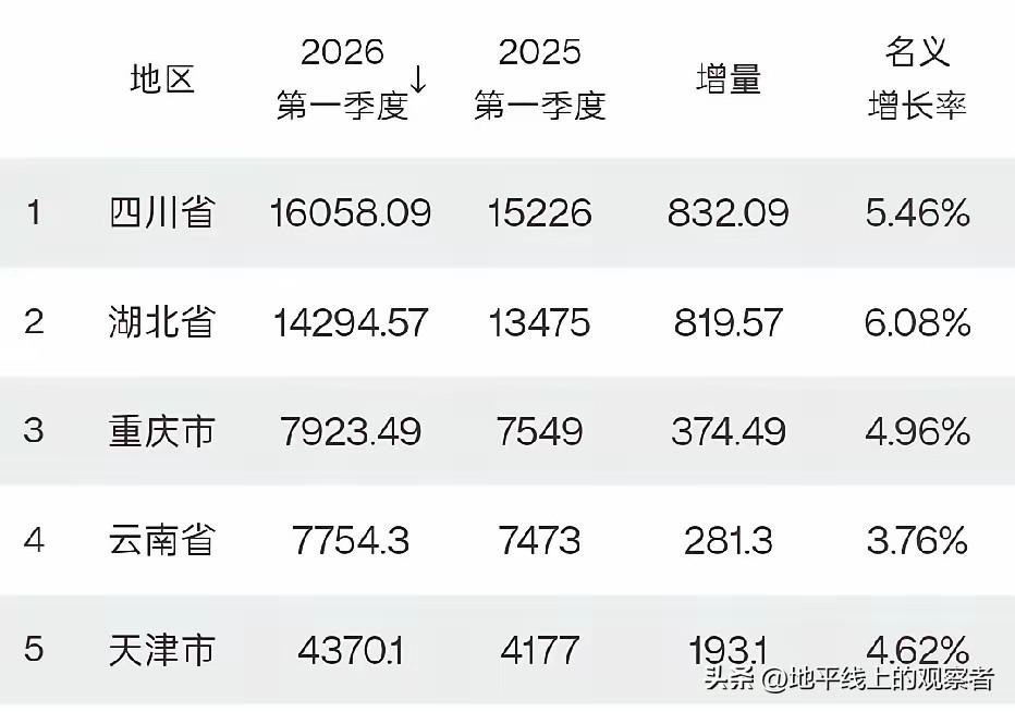 近日,多个省份陆续公布了2026年一季度的GDP数据,截至20日上午,已有四川、湖北、重庆、云南、天津、河南6省的GDP数据相继出炉。